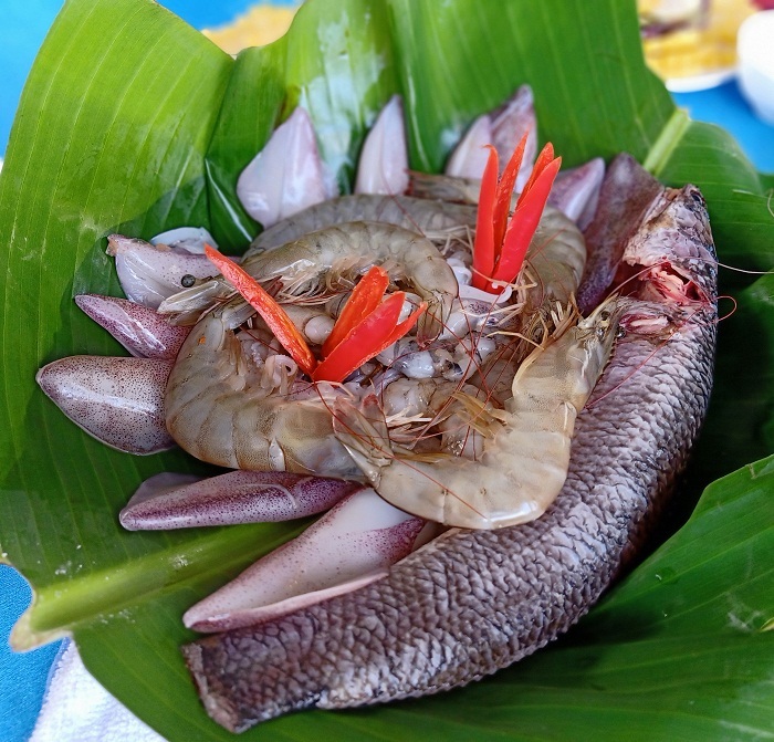这道火锅的用料很丰富,但很容易找到,鳗鱼,虾,蟹,鱿鱼,培根......,如果你有蛇头鱼,那就更美味了。在吃鱼露火锅的时候,还得准备各种蔬菜,香蕉树芯、空心菜、苦菜、菠菜、睡莲、小葱叶、盆栽、菠菜等。