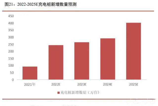 通过上述估算得出,预计 2022-2025 年充电桩新增数量分别为 244 万台、265 万台、292 万台、403 万台,2021-2025 年新增充电桩数量年均复合增长率将达 44%。