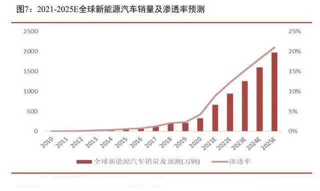 2022 年欧洲销量有望达280万辆。预计 2022 年全球新能源汽车销量有望达 1000 万辆左右;到 2025 年全球销量有望接近 2000 万辆,渗透率有望突破 20%,2021-2025 年复合增长率有望达 30%以上。