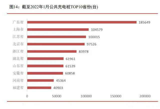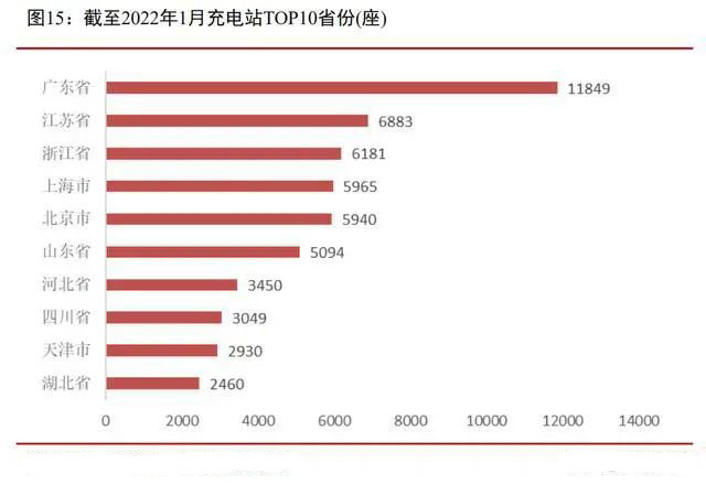 截至2022年 1 月,广东充电站保有量突破 1.1 万座,江苏、浙江突破 6 千座,上海、北京、山东突破 5 千座,河北、四川突破 3 千座,天津、湖北突破 2 千座。
