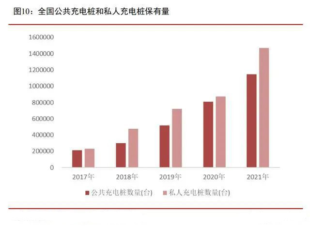 根据中国电动汽车充电基础设施促进联盟(EVCIPA)发布的数据,截至 2021 年底,全国 充电桩保有量达 261.7 万台,较 2020 年新增 94 万台,同比增长 56%。全国合计公共充电桩 114.7 万台,较 2020 年新增 34 万台,同比增长 42%。2017-2021 年,我国公共充电桩保有量从 21.39 万台增加至 114.7 万台,年均复合增长率达 52%;私人充电桩保有量从 23.18 万台增加至 147.01 万台,年均复合增长率达 59%。