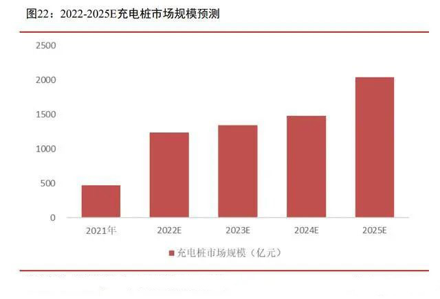 参照国家电网充电桩招标价格,直流充电桩平均价格约 10 万元/台,交流充电桩平均价格约 1.8 万元/台,假设 2022-2025 年交直流充电桩占比保持约 6:4,按此估算得出,2022-2025 年充电桩市场规模分别达 1241 亿元、1347 亿元、1482 亿元、2045 亿元。
