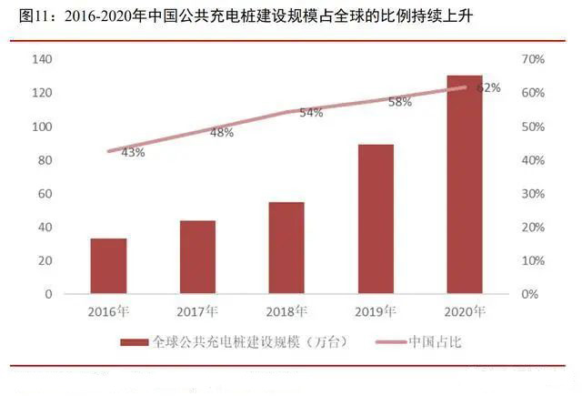 而根据 IEA 的数据显示,2016-2020 年,全球电动汽车公共充电桩建设规模持续上升,由 2016 年的 33.18 万台增长至 2020 年的 130.79 万台,年均复合增长率达 41%。2016-2020 年,我国公共充电桩的建设规模占全球建设规模的比例亦持续上升,由 2016 年占比 43%逐年上升至 2020 年占比 62%。