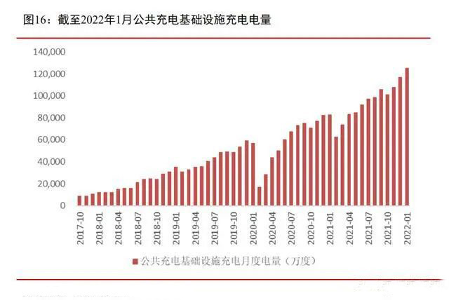 2021 年全国电动车充电总电量约 111.5 亿 kWh,同比增长 58%。2022 年 1 月全国充电总电量约 12.53 亿 kWh,同比增长 51.3%,环比增长 7.1%。电量流向仍以公交车和乘用车为主,环卫物流车、出租车等其他类型车辆占比较小。