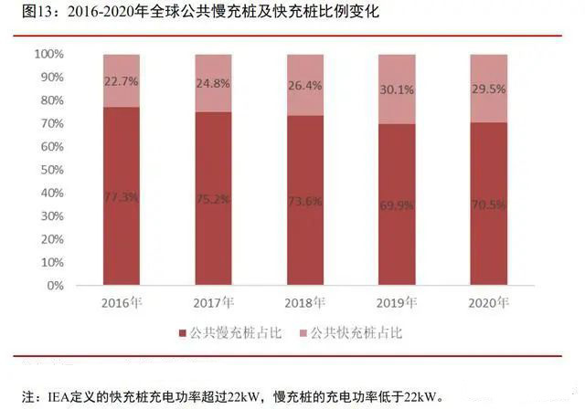 纵观 2016-2020 年全球电动汽车公共慢充桩及快充桩建设规模的比例变化,快充桩的占比呈逐步提升的趋势。2020 年慢充桩占比约七成,快充桩占比约三成。提高电动车充电速度是行业发展趋势,未来快充桩占比仍有望逐步提高。