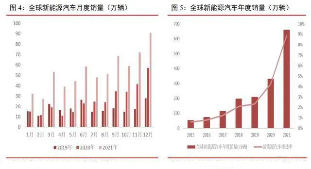 根据国际能源署的最新数据,全球 2021 年新能源汽车销量达 660 万辆,同比增长约 1 倍。2021 年全球新能源汽车渗透率近 9%,高于上年 4.7pct。