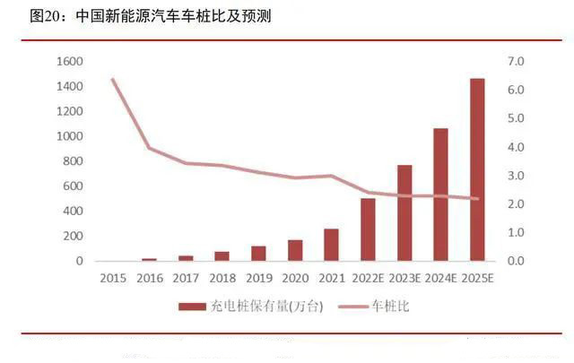 也就是说,2022 年公共充电桩和私人充电桩合计保有量将达 506 万台。由此预测 2022 年车桩比将为 2.4:1。假设 2022-2025 年车桩比呈逐步下行趋势,到 2025 年车桩比进一步下降至 2.2:1,则届时充电桩保有量将达 1466 万台。