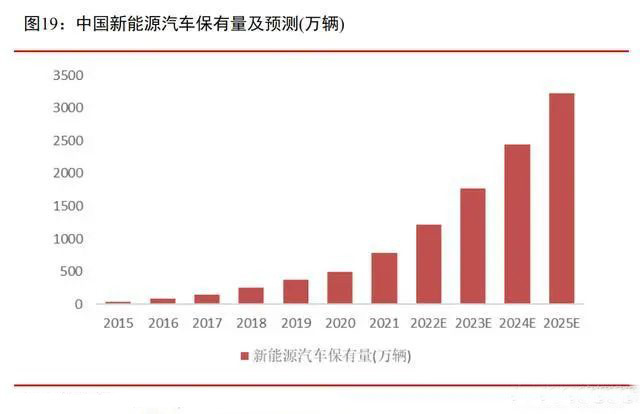 假设我国 2022-2025 年新能源汽车的报废率约为 8%,结合我们对 2022-2025 年新能源汽 车销量的预测,预计到 2022 年新能源汽车保有量将达 1221 万辆,到 2025 年将增加至 3224 万辆。