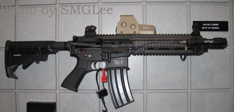 诞生之后,三角洲用着也是挺满意,立马买了。这把HK M4虽然挂了个M4的名,但是却是一个新枪,并且虽然这枪是三角洲买的,但是产权在自己,自己也是要卖的。类似SHOT SHOW这样的展示的机会,自然是不能放过。但是在SHOT SHOW上展出之后,柯尔特立马发难:M4的商标是我的,你们不能用,你们给我钱~~~~然后两家开始打官司,最后H&K改名,改了个HK416。