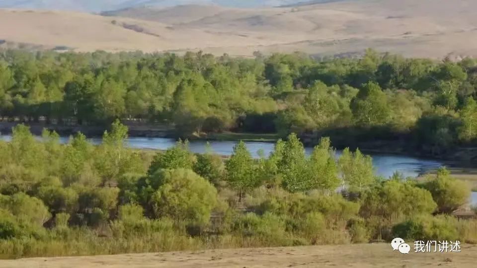 第二天早晨我走到鄂嫩河边。虽然已经6月份了,但只有河两岸的树林绿了,草原还是土黄色,绿草还没长出来。鄂嫩河的水清澈透明,在初升的阳光下闪闪发光。