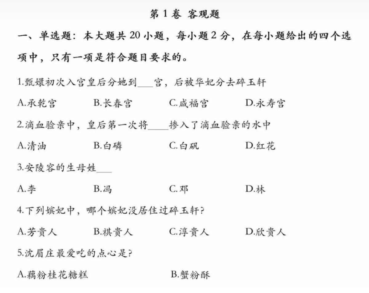 《甄嬛传》的大火推动了甄学的产生,而每年都有人乐此不疲地出甄嬛传考题,也有许多人乐此不疲地更新自己的甄学知识。给大家附上一份《甄嬛传》的考题,考考大家对《甄嬛传》的掌握程度如何。大家知道沈眉庄最爱的糕点是什么吗?安陵容的生母姓什么呢?甄嬛初入宫时本来要住在哪儿呢?快点在评论区里留下你的答案吧!