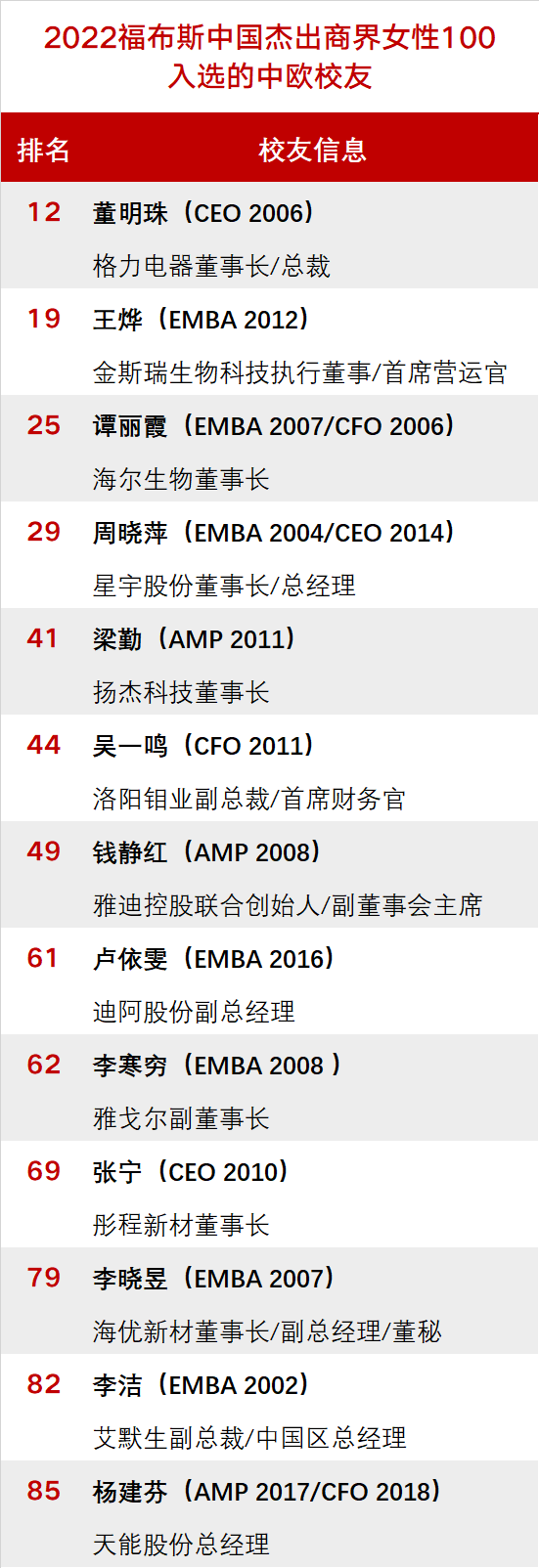 3月3日,福布斯中国发布2022“中国杰出商界女性100”榜单,13名中欧国际工商学院(以下简称“中欧”)校友上榜,涵盖了电器制造、医疗健康、生物制药、零售、新能源、高新科技等行业。