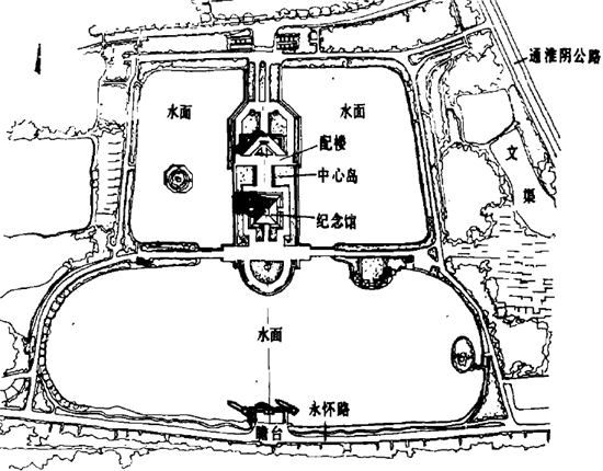 周恩来纪念馆由齐康院士设计,选址在水中的一个半岛上,建筑融于自然之中。造型上采用抽象的方形,象征着中国传统思维中的“天圆地方”观,具有“正直”“中和”“方正”“四面八方”之意。此外,将方形置于“中轴岛”的圆形外堤中,通过强烈的对比,更加强调和突出方的形象。建筑中的四根石柱隐喻着周恩来总理生前提出的四个现代化,从正门拾级而上的51级台阶隐喻着周总理自23岁投生革命,历经28年于51岁被任命为国务院总理的历史。