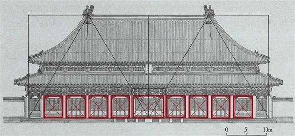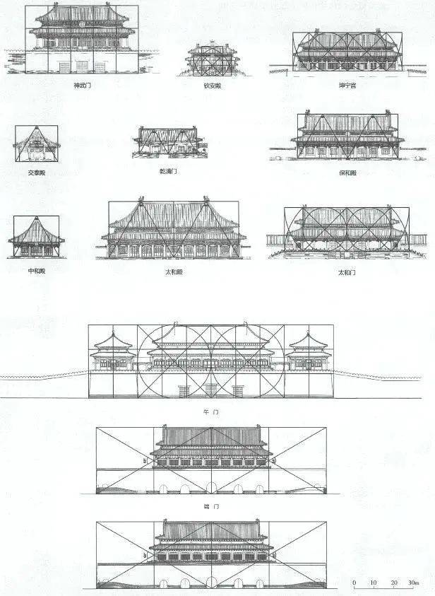 古人在宫殿的规划设计中常以“象天法地”概括。紫禁城的名称,首先就是象征天帝之居所,因此,有学者通过对紫禁城中二十余座单体建筑的构图比例进行了分析研究,印证了方圆作图比例(1:√2:2)在建筑中的广泛运用;同时,紫禁城整体规划同样遵循着近似的比例关系。