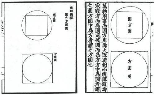 中国古人追求天、地、人和谐的思想,“天圆地方”的观念深入人心。蕴含此观念的中国古代建筑设计中的方圆作图比例手法历史悠久,已经过数千年的文化积淀。《周髀算经》指出:“数之法出于圆方。圆出于方,方出于矩,矩出于九九八十一。”“万物周事而圆方用焉,大匠造制而规矩设焉。”北宋的《营造法式》一书中,出现在图版中的第一幅图样即是“圆方方圆图”,分别为一幅“圆方图”(绘一圆与其内接正方形)与一幅“方圆图”(绘一正方形与其内切圆)。