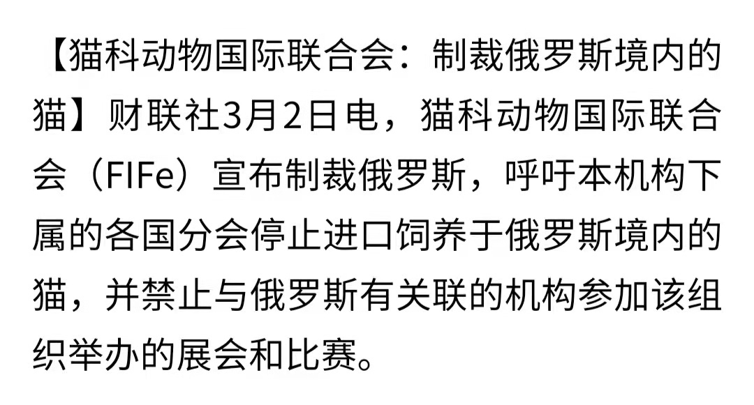 2022年3月,俄乌冲突持续升级,继冻结普京资产后,西方开始制裁俄罗斯的猫,宣布俄罗斯境内的猫:不得在外登记、参展。