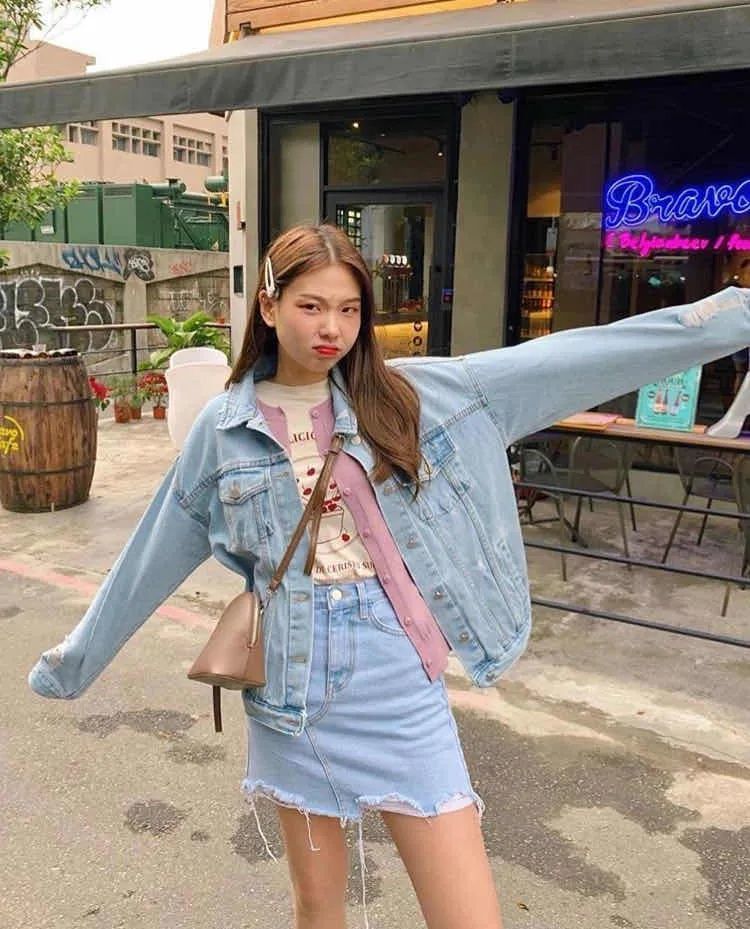 搭配小短裙会比较俏皮可爱,牛仔在外套在遮住臀部的位置,就算穿包臀裙也不用担心臀型不好看。