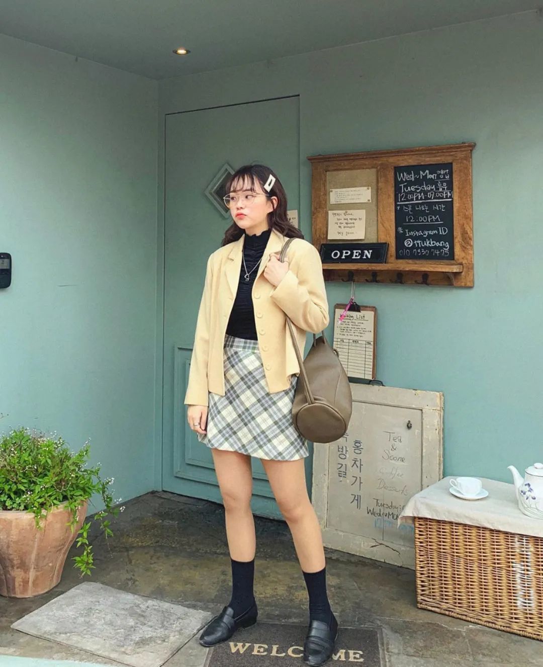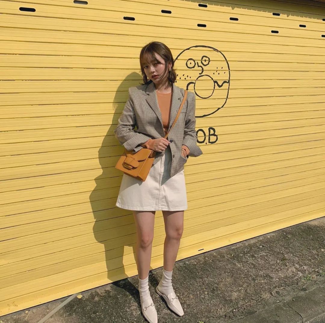 学生党小可爱不妨试试看格纹西装,用活力的橙色点缀,减少西装的沉稳职业感,搭配白色半裙与小白鞋,为春天增添一抹清爽。