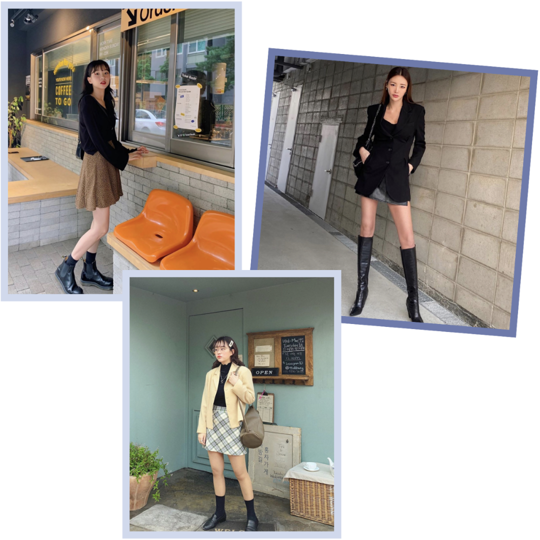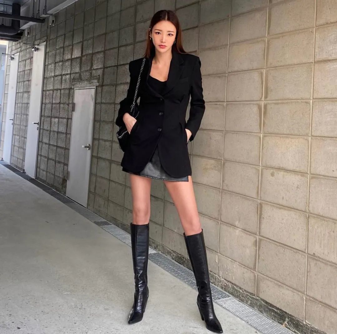 有收腰设计的西装,即使没有特意突出腰线的位置,也会增加下半身的比例,大腿纤细的小可爱,可以尝试搭配高跟长筒靴,帅气到不行!