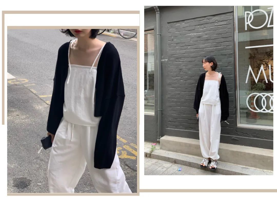 个性女孩也有个性女孩穿法,白色吊带搭配同色收脚裤,随性且放松,黑色针织外套很酷很低调,还会降低上衣的欲感,只若隐若现露出绑带一角,性感又可爱。
