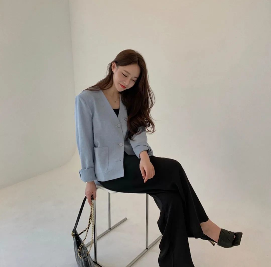 看腻了黑与白的西装外套,婴儿蓝的柔软给你眼前一亮的感觉,披散着长发,瞬间溢满了女人味!