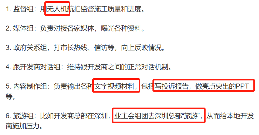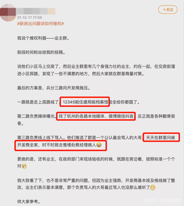您可别以为就是业主群而已,首先是业主主动利用某博等公开社交媒体平台,集结更多的“友军”;更重要的是群内分工明确,兵分三路向开发商施压。
