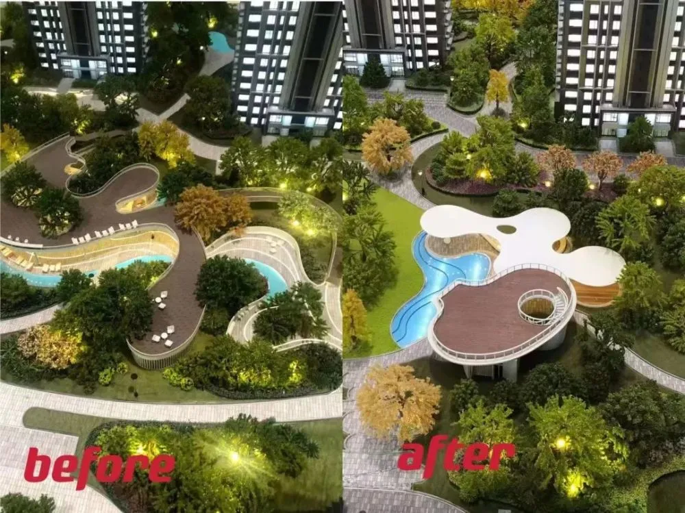 曾经沙盘上7号楼南侧设有儿童游戏下沉广场、钢结构镂空鸟巢家长看护交互空间、雕塑小品、缓坡钢结构景观桥,到了新沙盘上全都消失不见了;