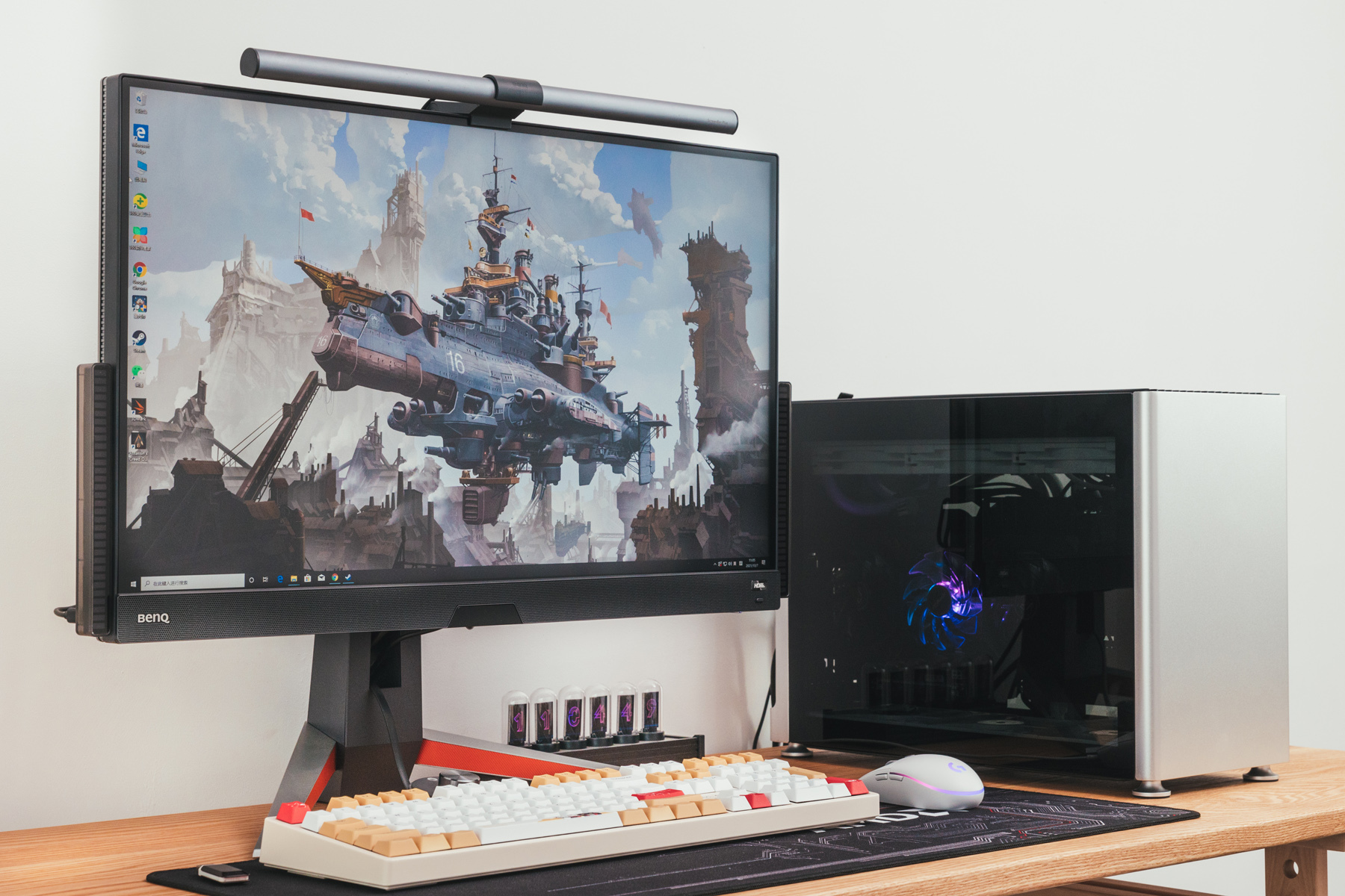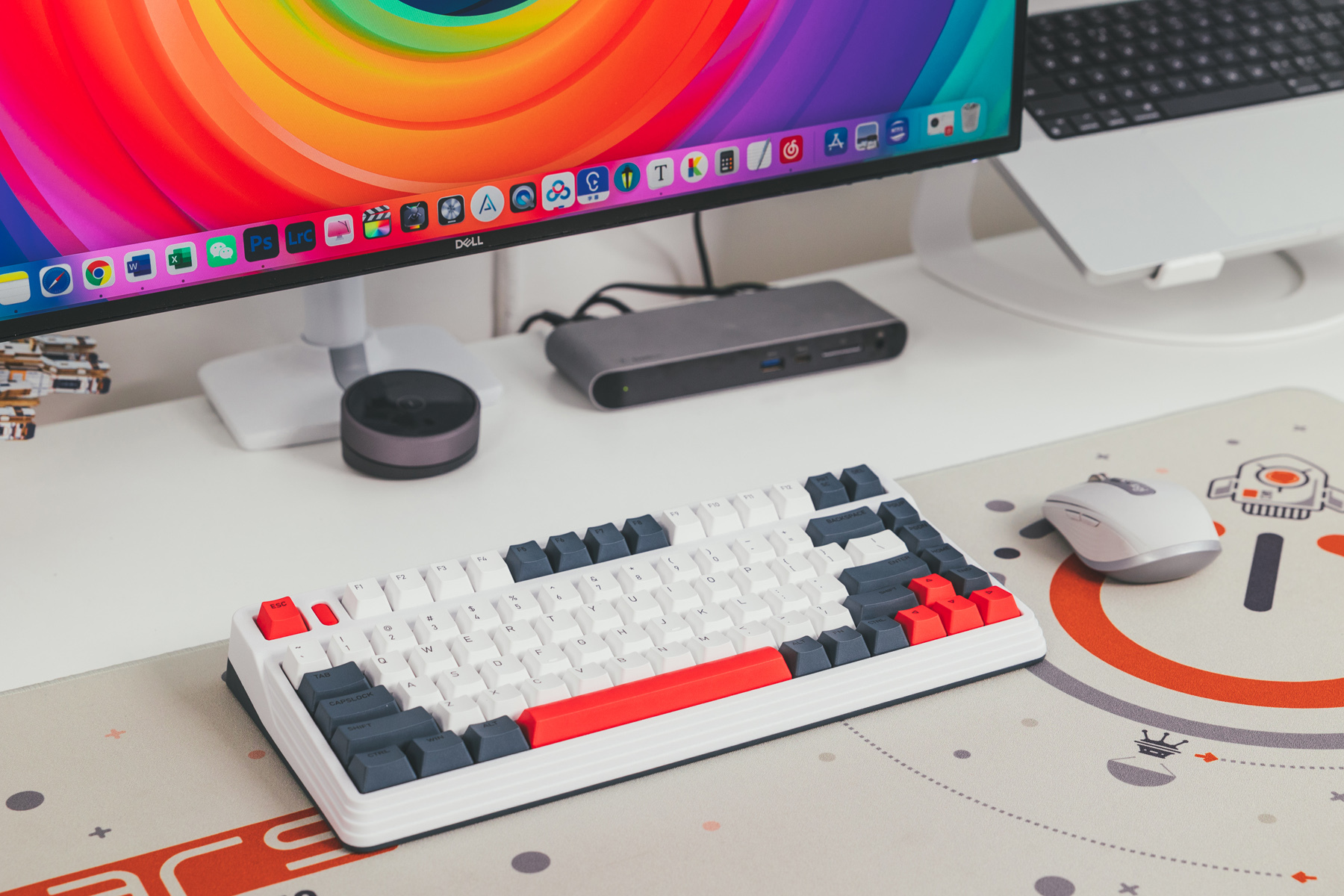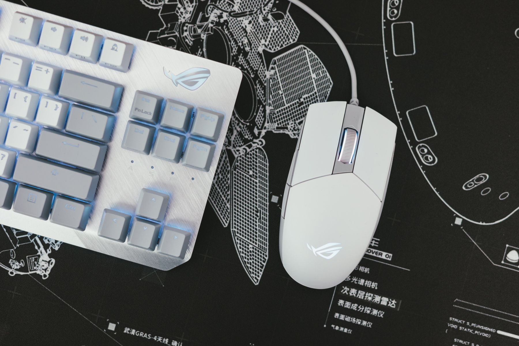 之前尝试搭建过一个以游戏本为核心的游戏娱乐桌面,搭配的键盘就是ROG 游侠TKL月耀白机械键盘,不过个人感觉还是搭配全白桌面更匹配一些。