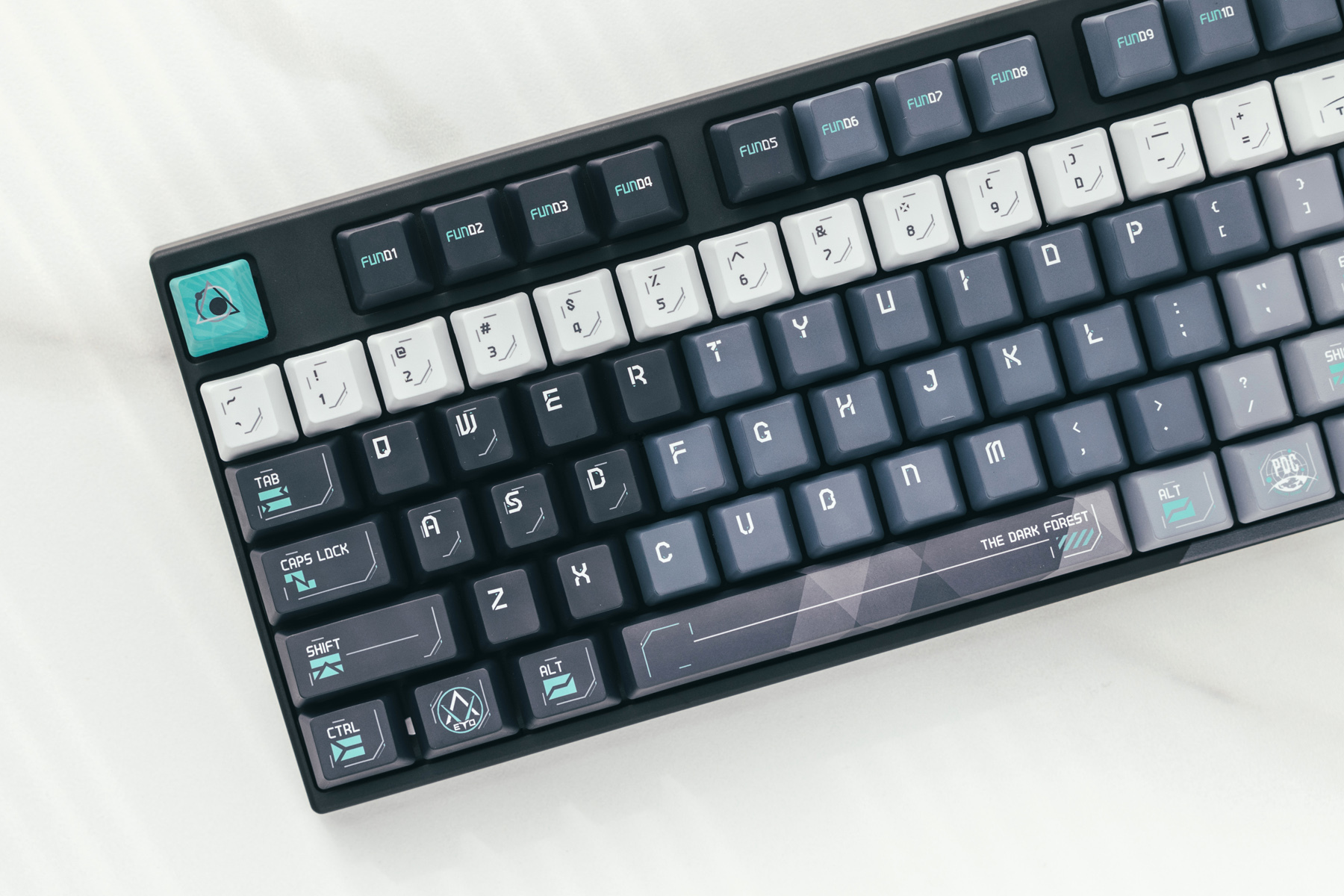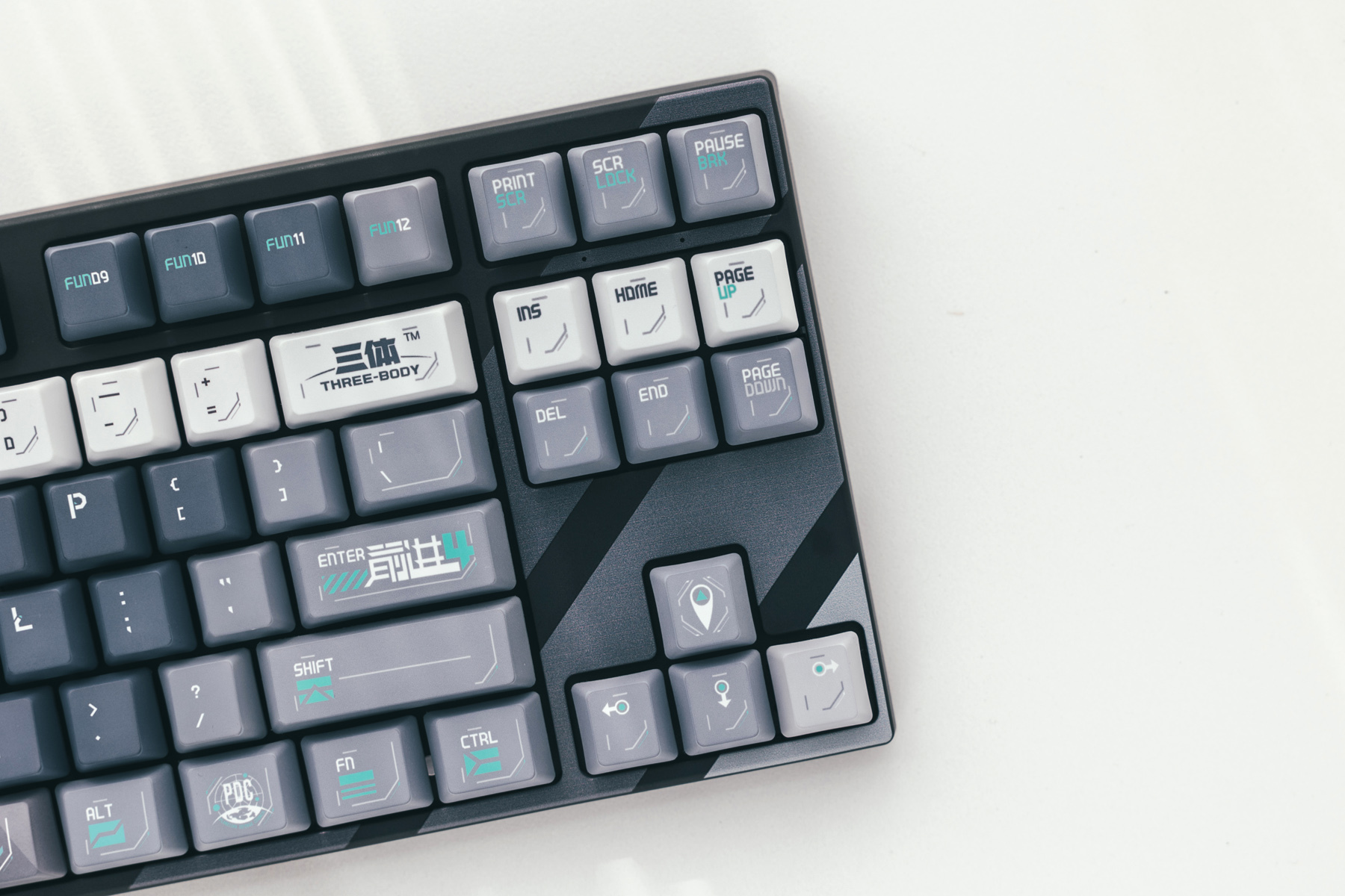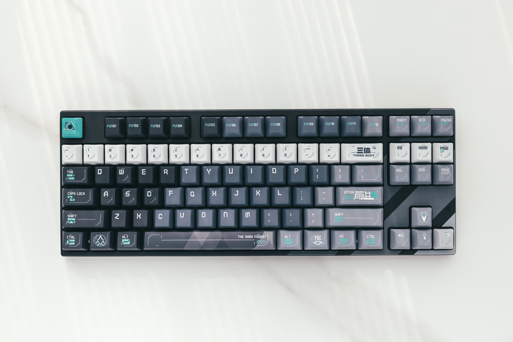 定制元素方面,还是下了一些功夫的,比如ETO(地球三体组织)的logo、PDC(行星防御理事会)元素,回车键上标识了“自然选择号”最大加速档位前进四(光速15%)以及ESC上代表了三体文明的抽象图案。