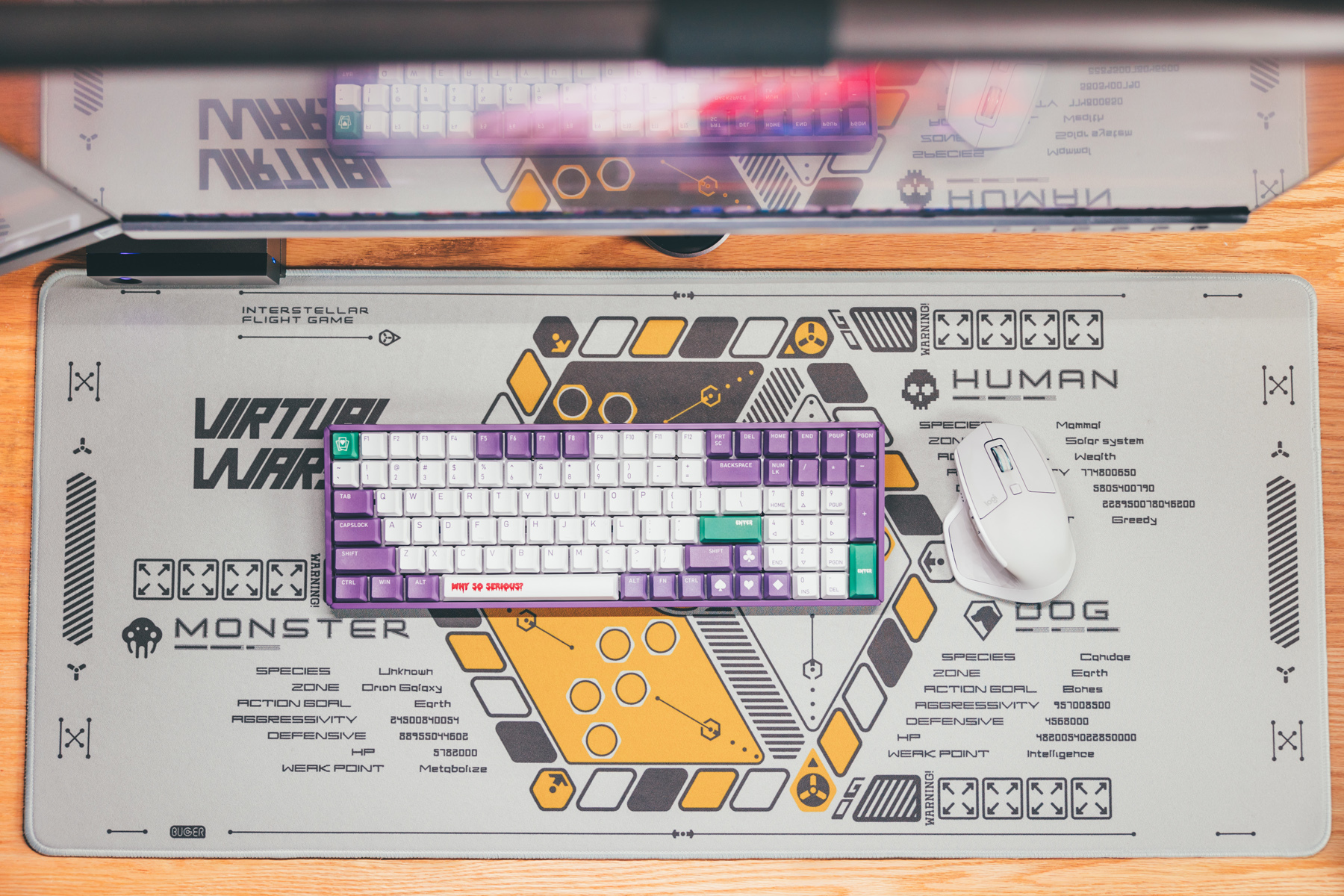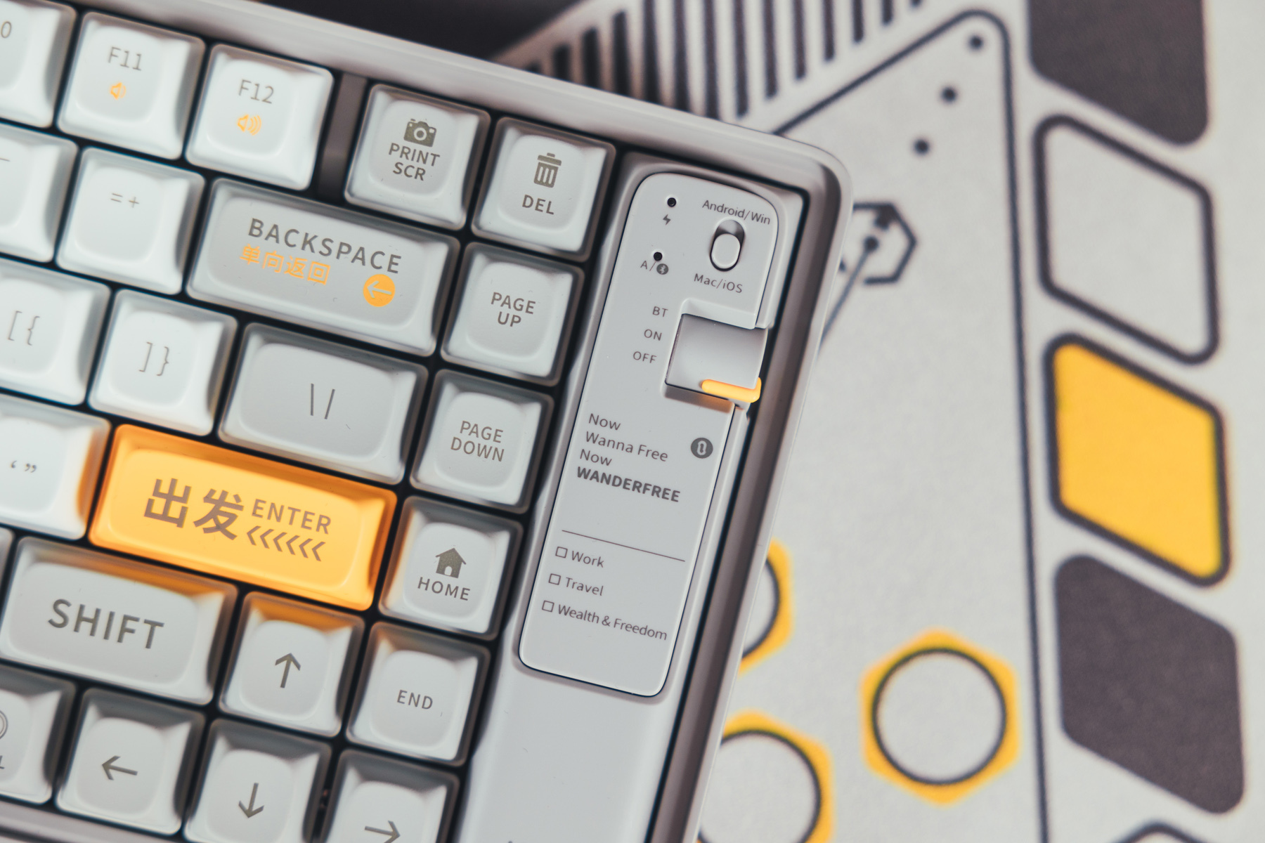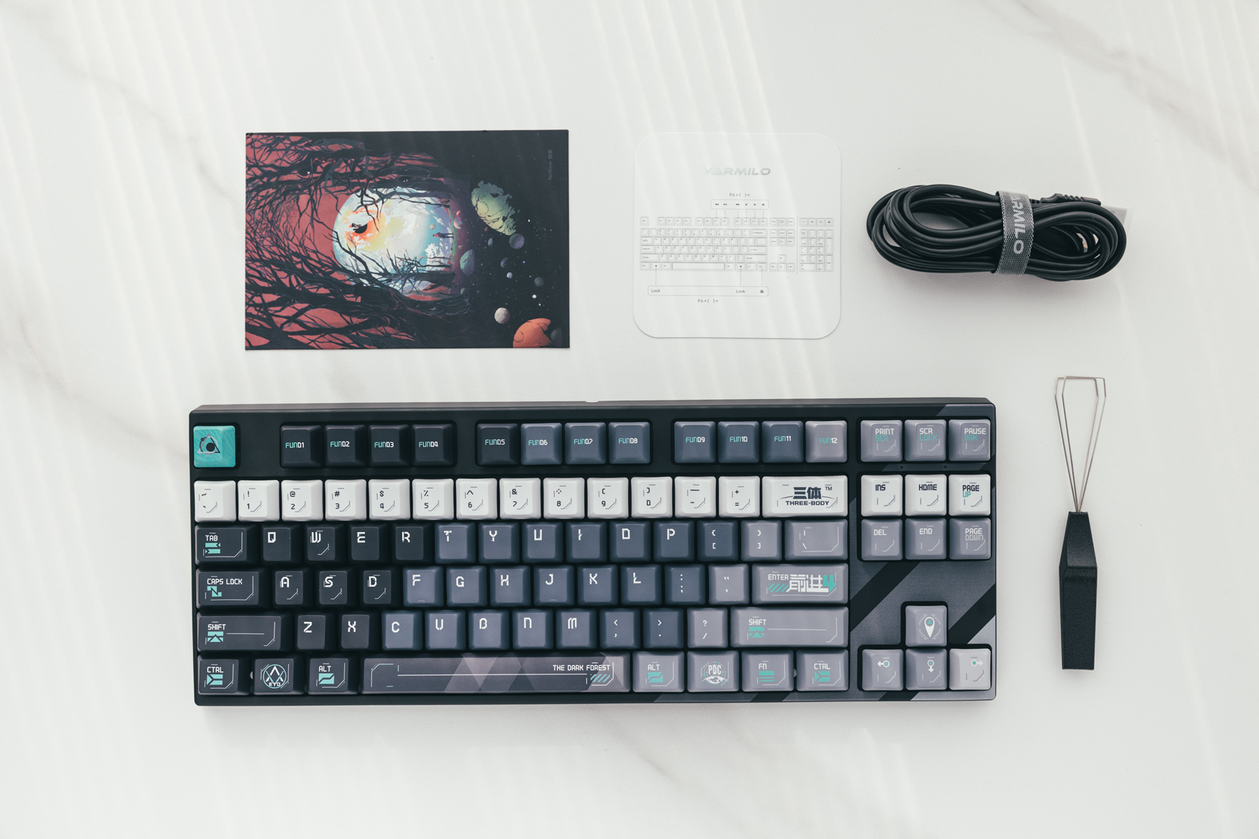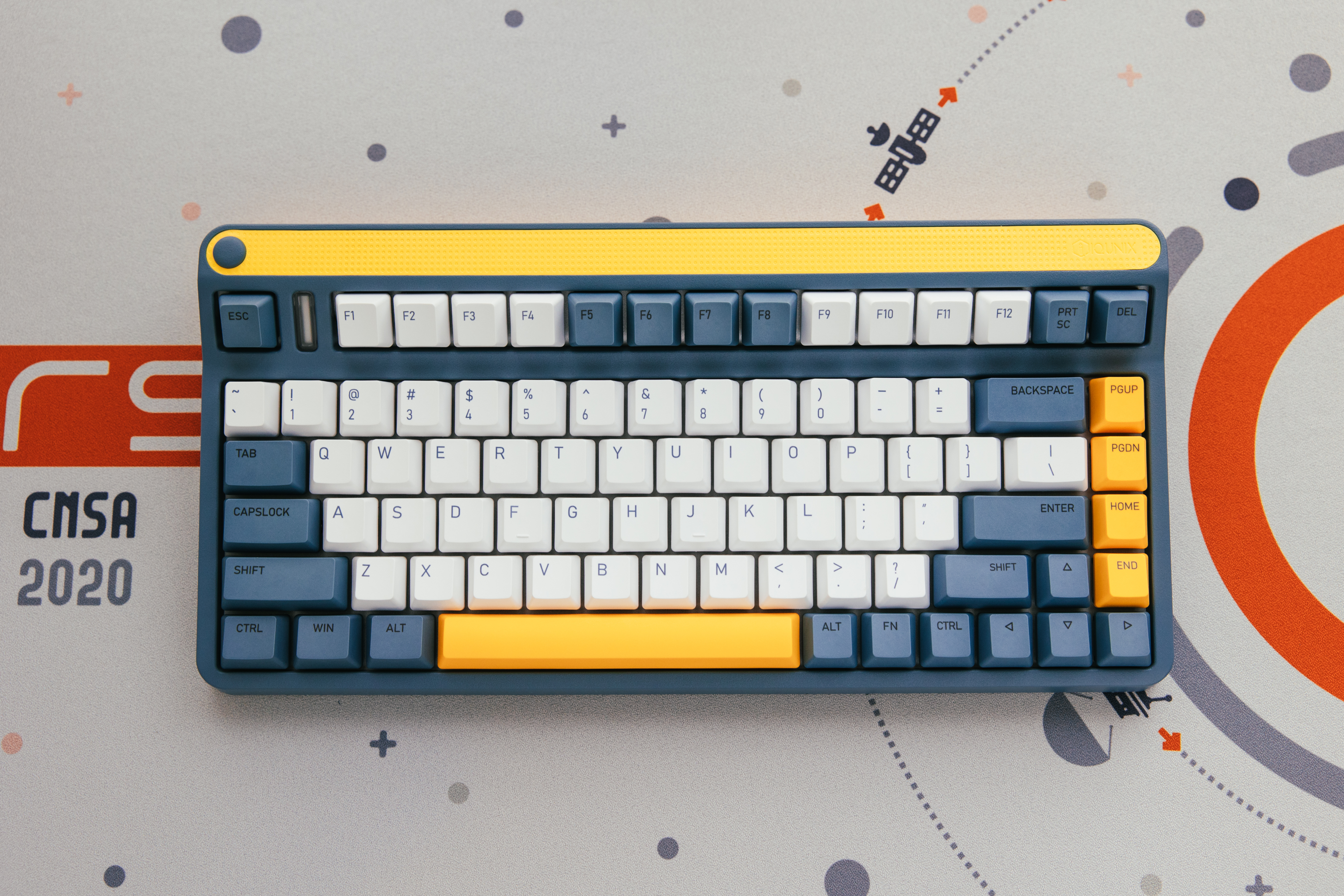 定制元素方面,还是下了一些功夫的,比如ETO(地球三体组织)的logo、PDC(行星防御理事会)元素,回车键上标识了“自然选择号”最大加速档位前进四(光速15%)以及ESC上代表了三体文明的抽象图案。