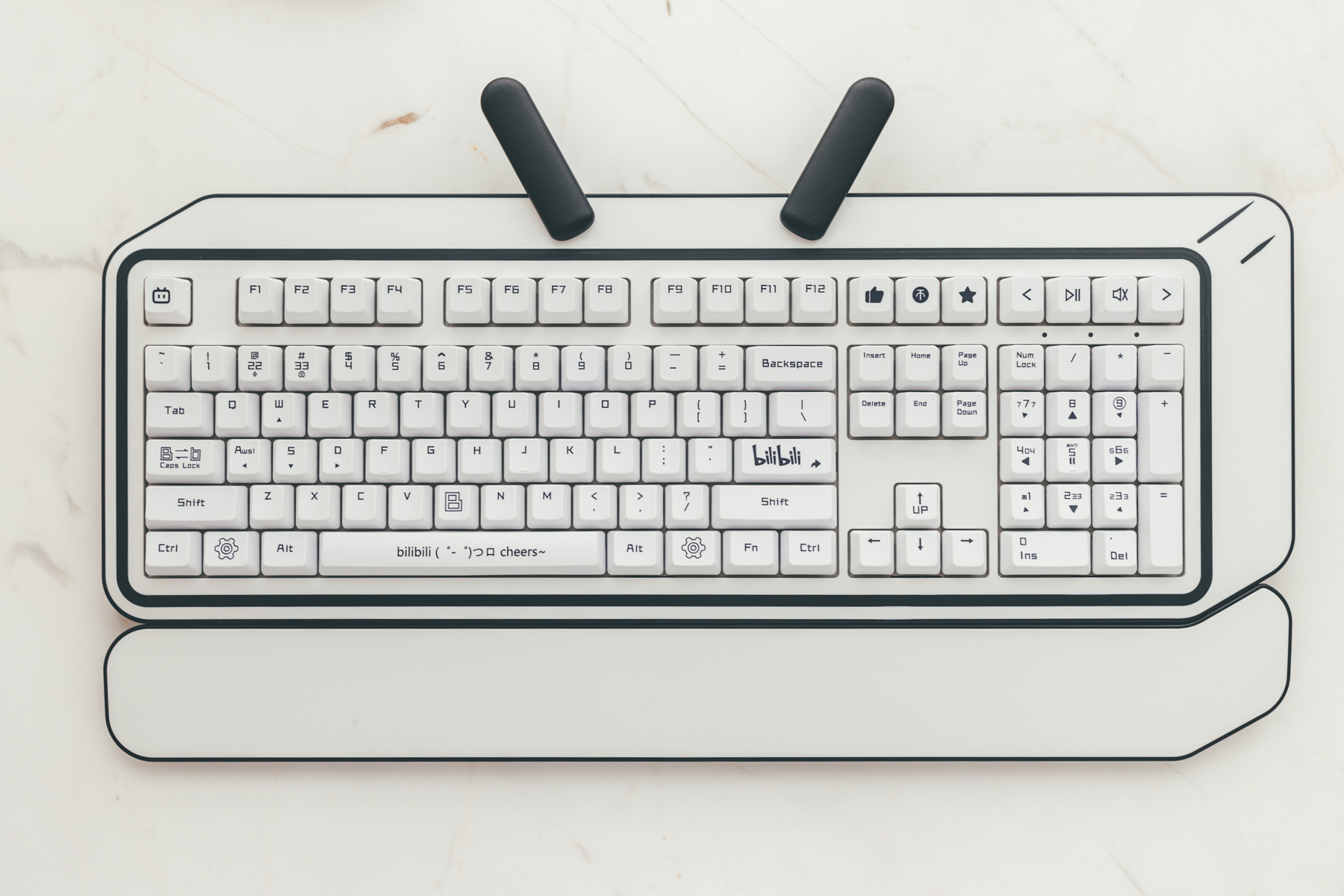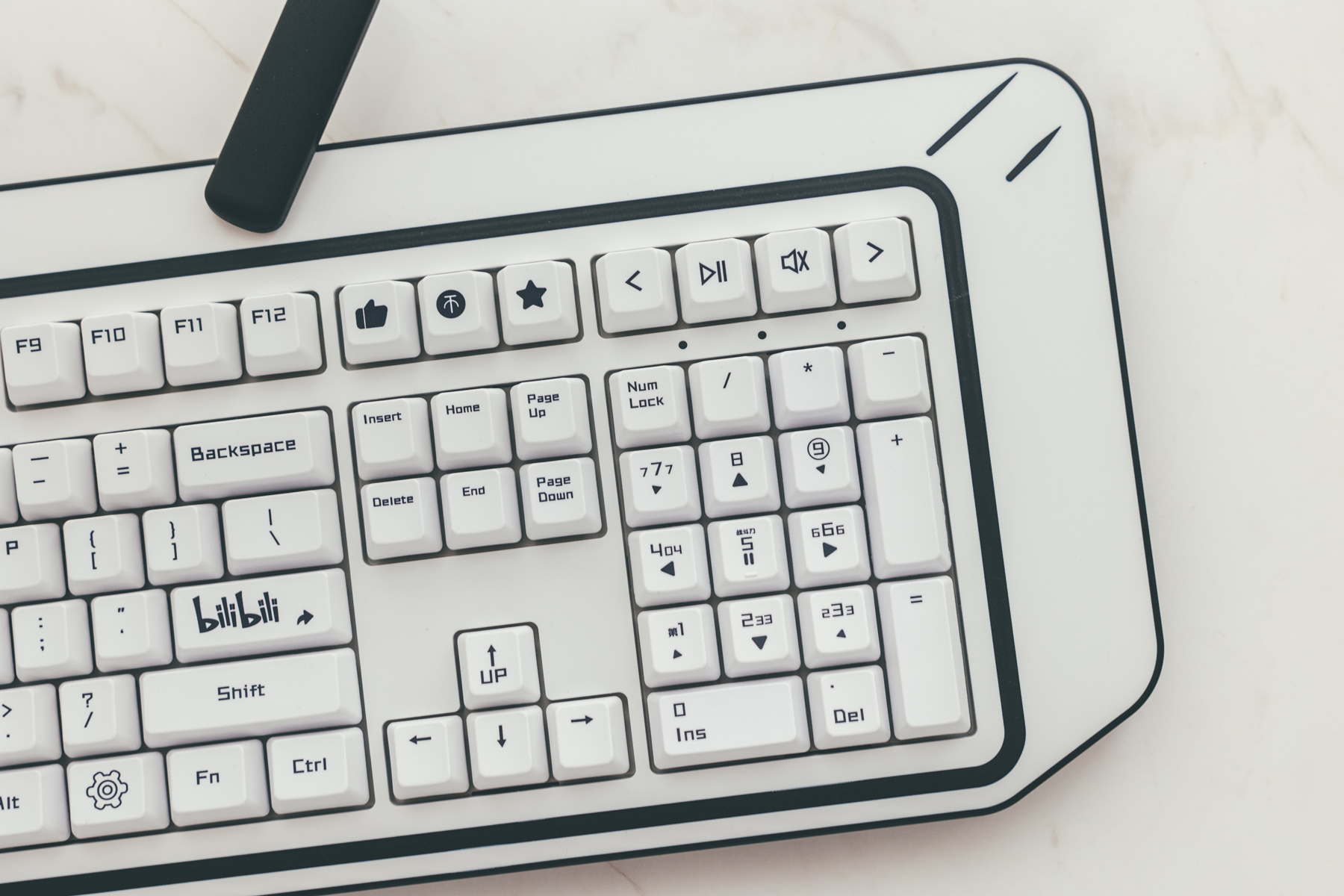 这把键盘的体积要比常见的104/108键盘大上一两圈,整把键盘做了一个破次元的设计,动漫风满满,B站元素也算是下了功夫。