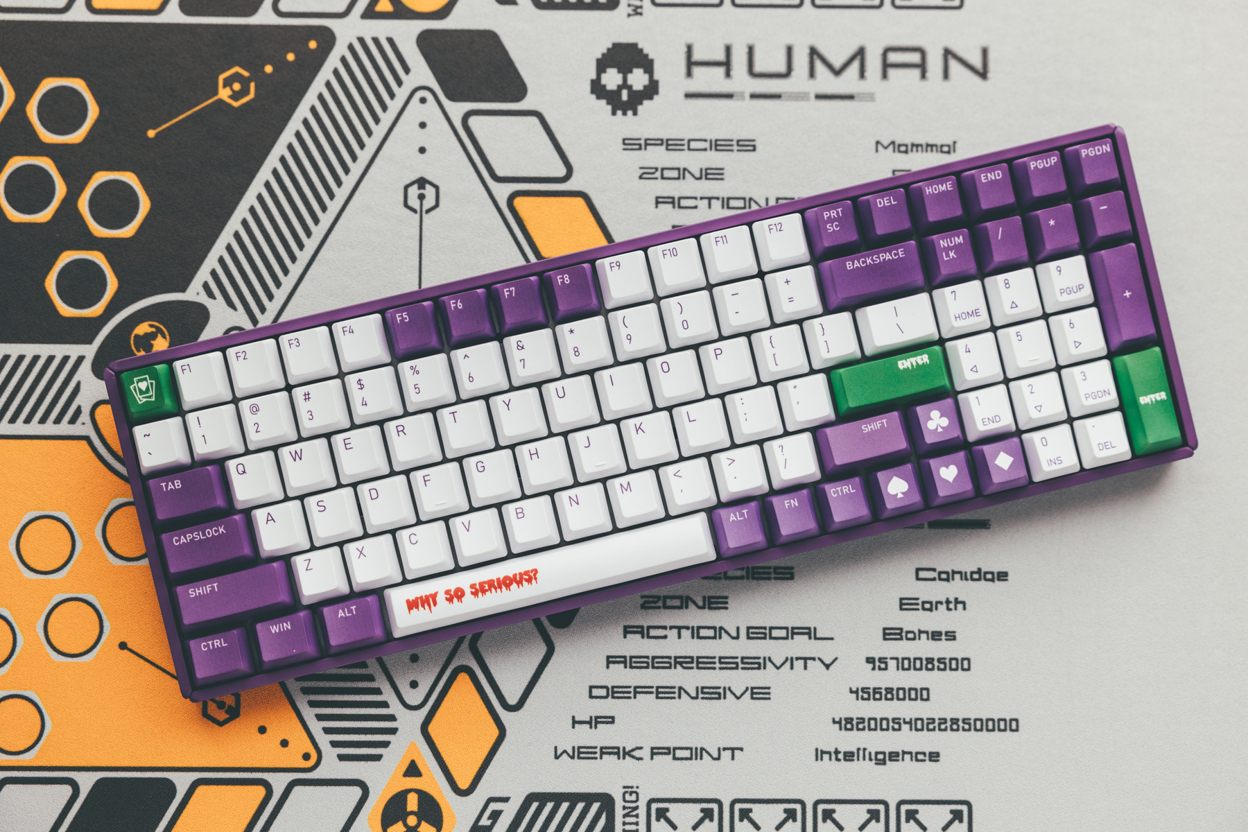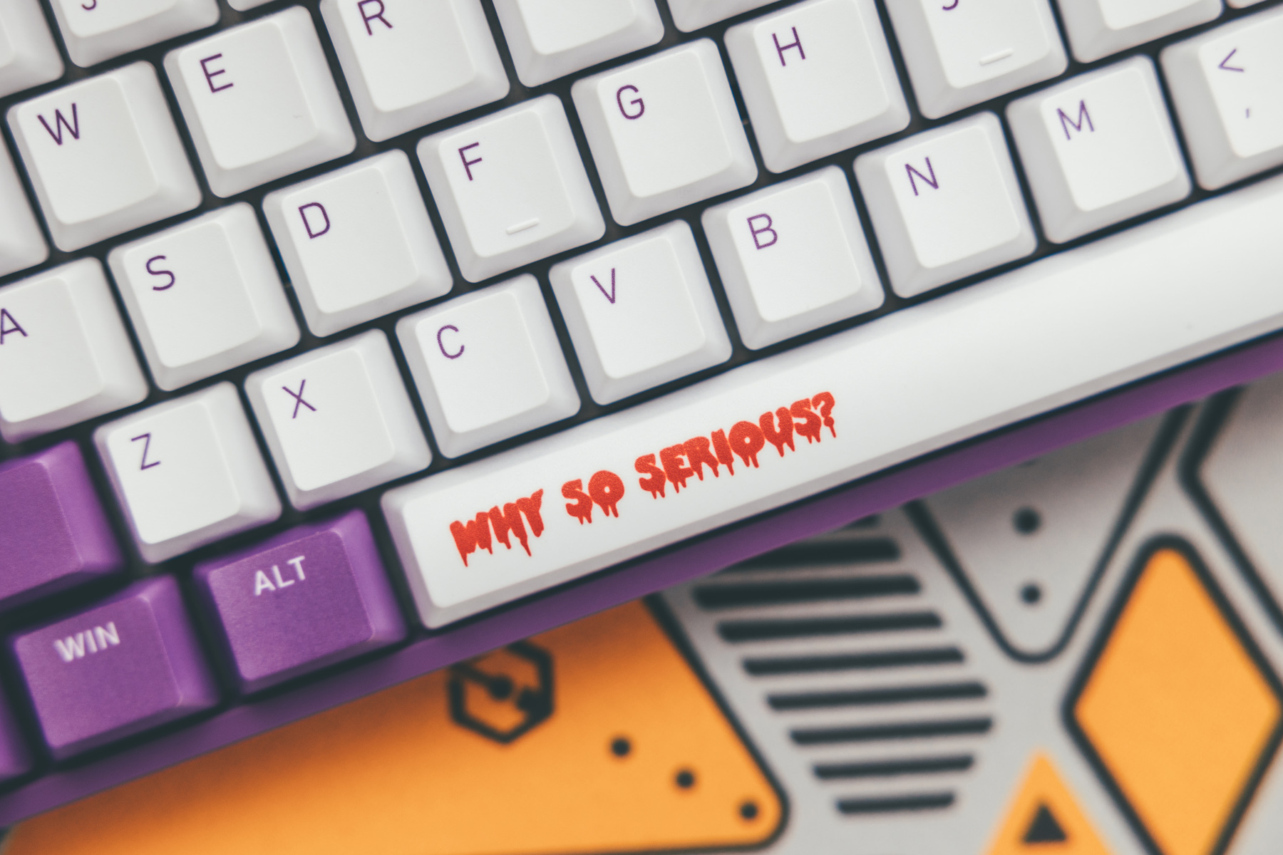 不过后续出售的F96 joker 空格键按键上的 “why so serious?”这个元素消失了,大概是量产发现精确印刷成本较高。