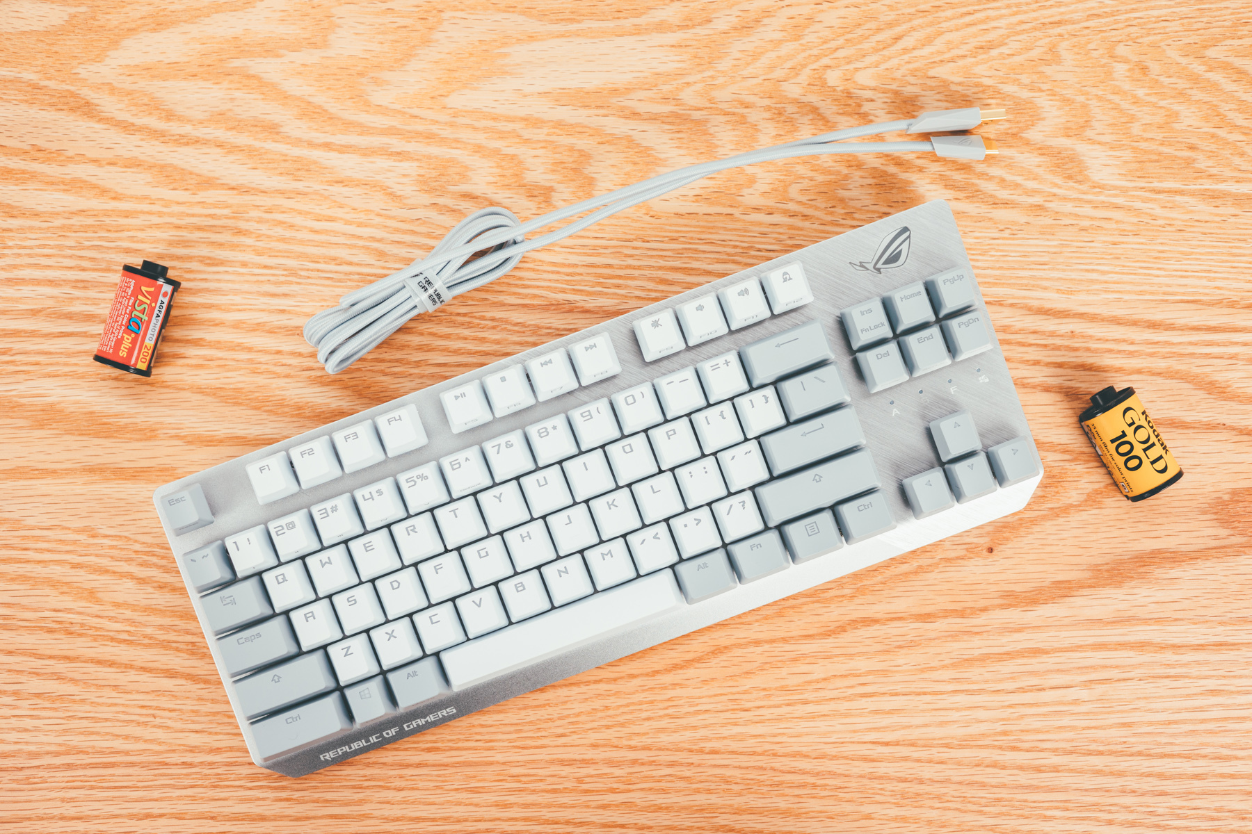 游侠TKL月耀白机械键盘是ROG少有的白色款机械键盘,ROG信仰加成也加分了不少,而且我个人比较偏好87按键规格的键盘,键线分离的设计让收藏也没那么麻烦。