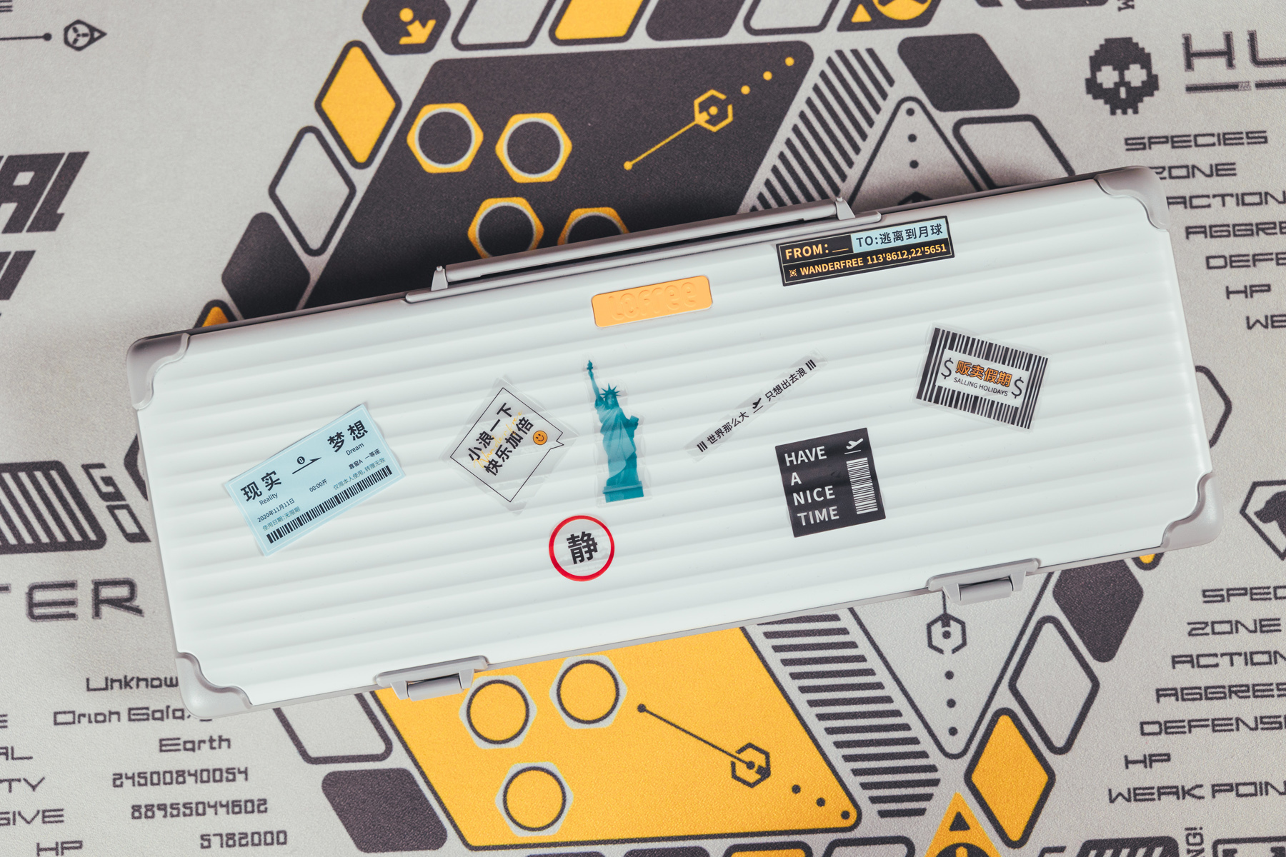合盖后整体造型类似一个行李箱,贴上随机附带的贴纸,挺富有诗意的设计 。