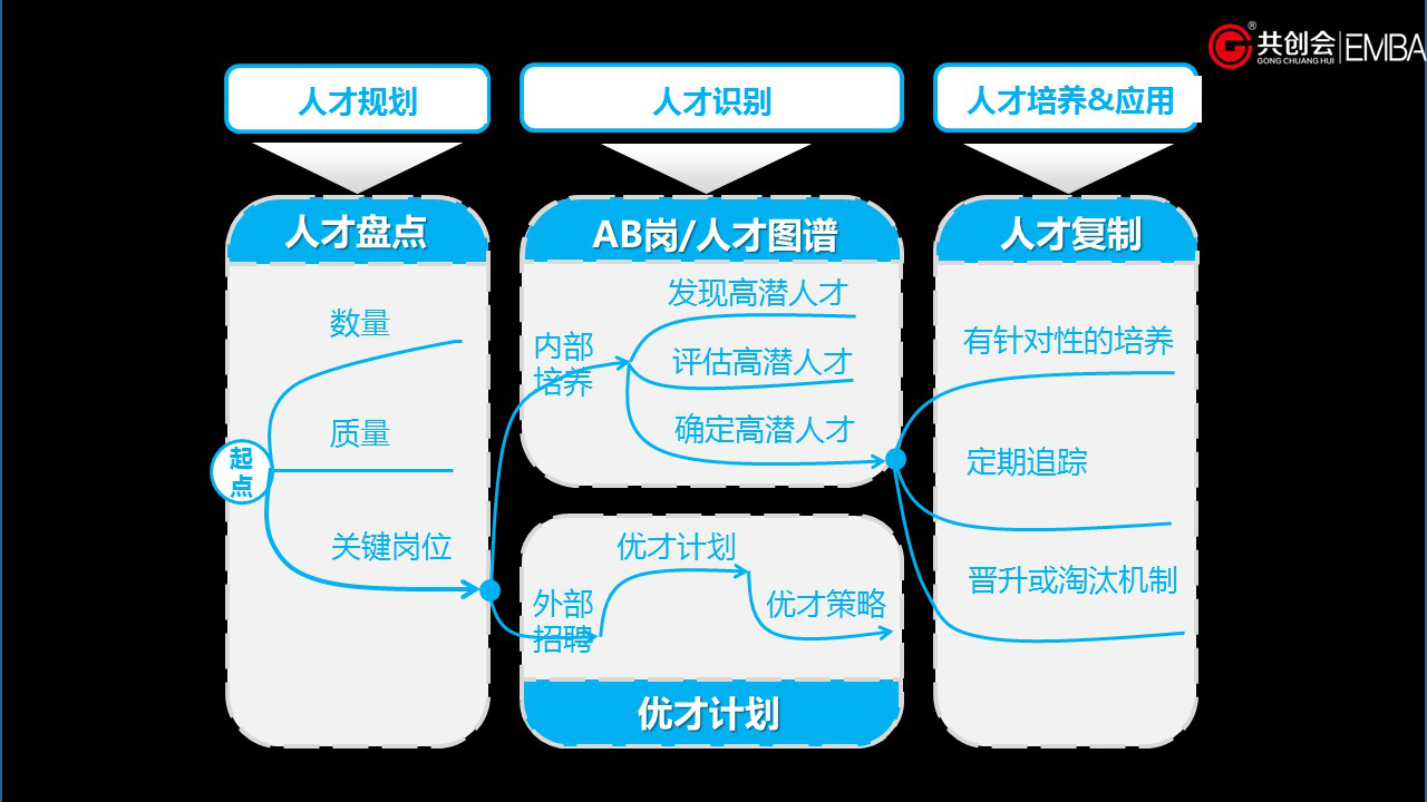 BLM业务领先模型中的人才,除了我们常说的数量与质量以外,更为重要的是如何形成选、用、育、留的机制。人才管理有三个核心要点来确保对企业战略的承接,分别是关键岗位识别、人才队伍盘点和人才战略制定。