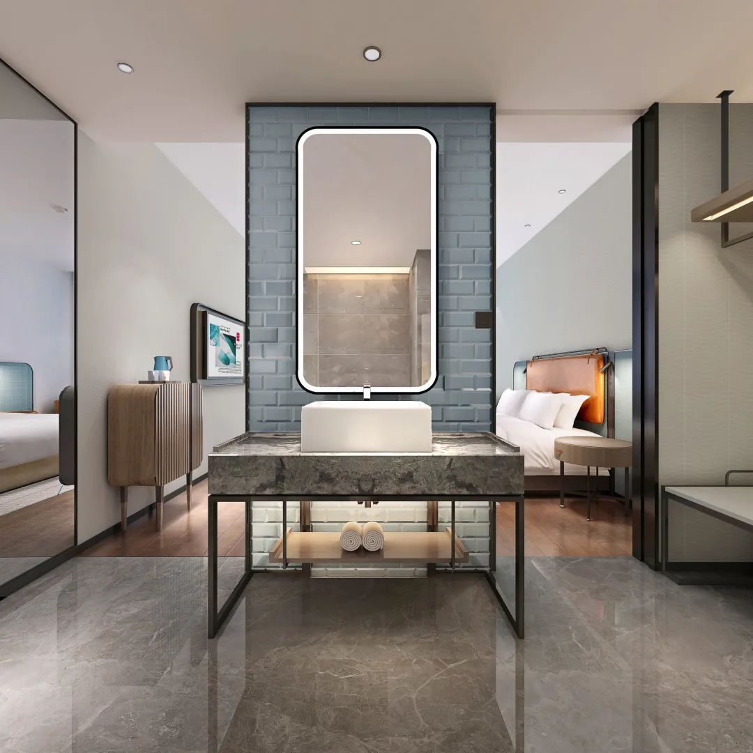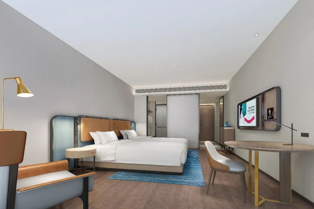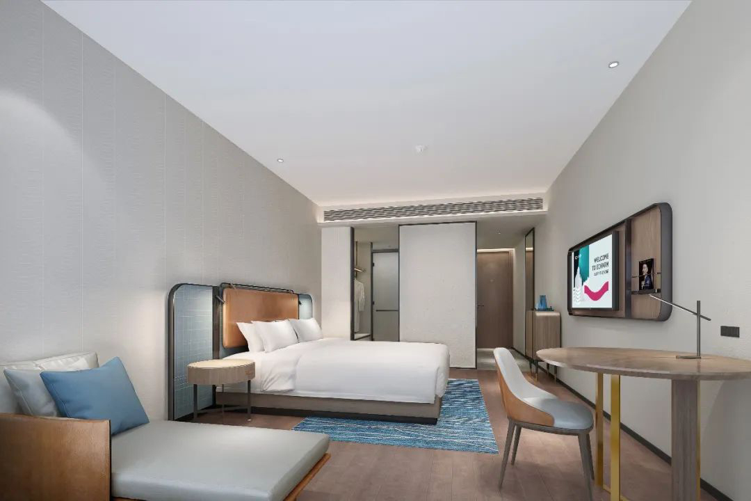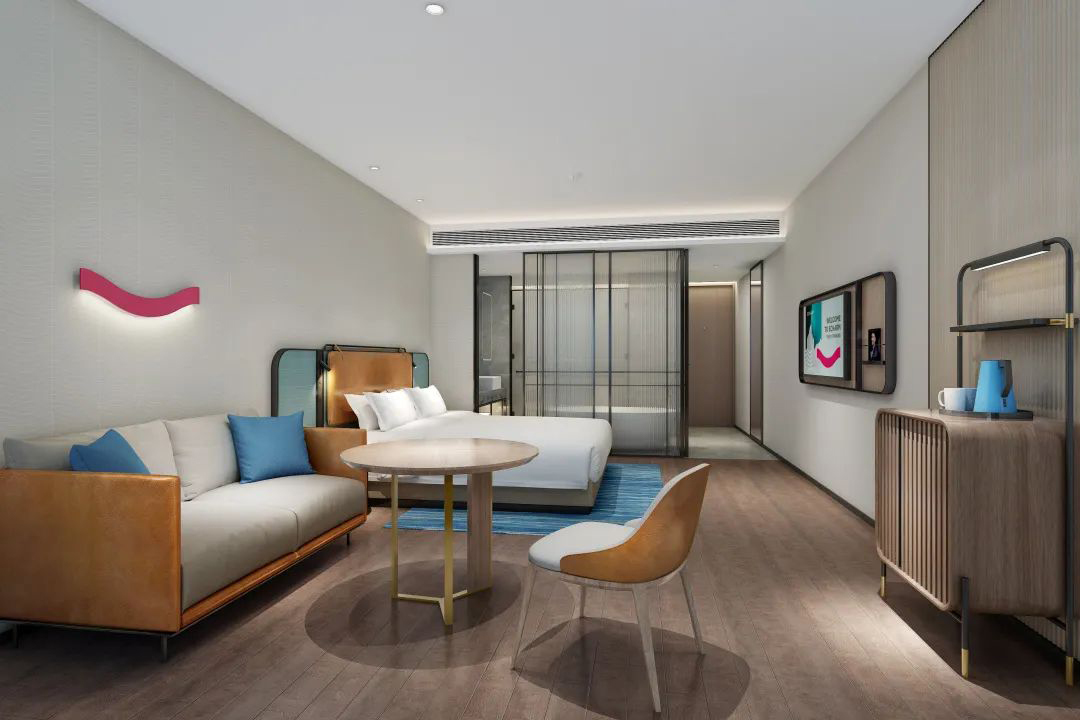 客房延续轻奢北欧风格,以米色系为主调搭配木质地板,没有多余装饰及线条。半步入式衣柜增加客房的通透性,化繁为简。洗漱间与客房打破墙体壁垒,缩短客人从客房到洗漱区的动线,有效提升入住舒适感,迎合年轻一代消费者的喜好。