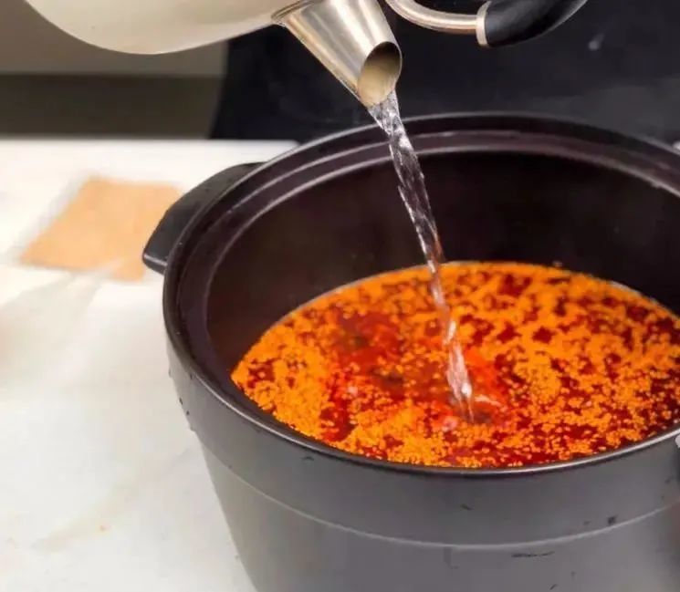 7. 炖锅里放入2袋钵钵,倒入2升左右的热水,搅拌均匀鸡的料包。