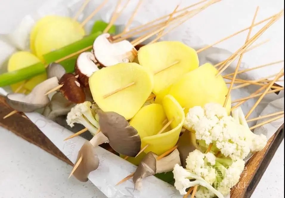 1. 蔬菜洗净切好用竹签串起来(根据自己喜好来选择,各种蔬菜都可以)。