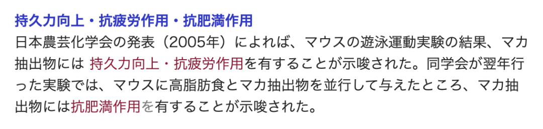 有资料显示,2005年日本农芸化学会的报告里更是提到,在小白鼠游泳的对照使用中,玛咖提取物有着抗疲劳和提高持久力的作用。
