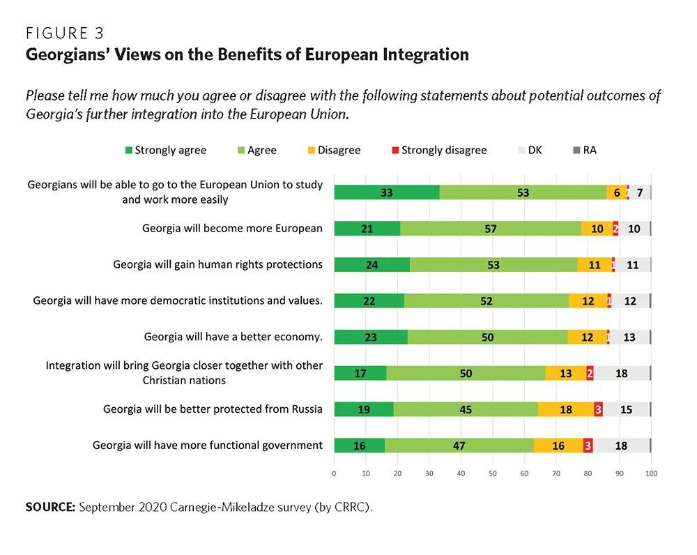 调查显示,格鲁吉亚人认为,融入欧盟最大的好处是经济文化交流上的。他们可以更方便地去欧洲接受教育,获得更多人权上的保障,经济状况能变得更好。
