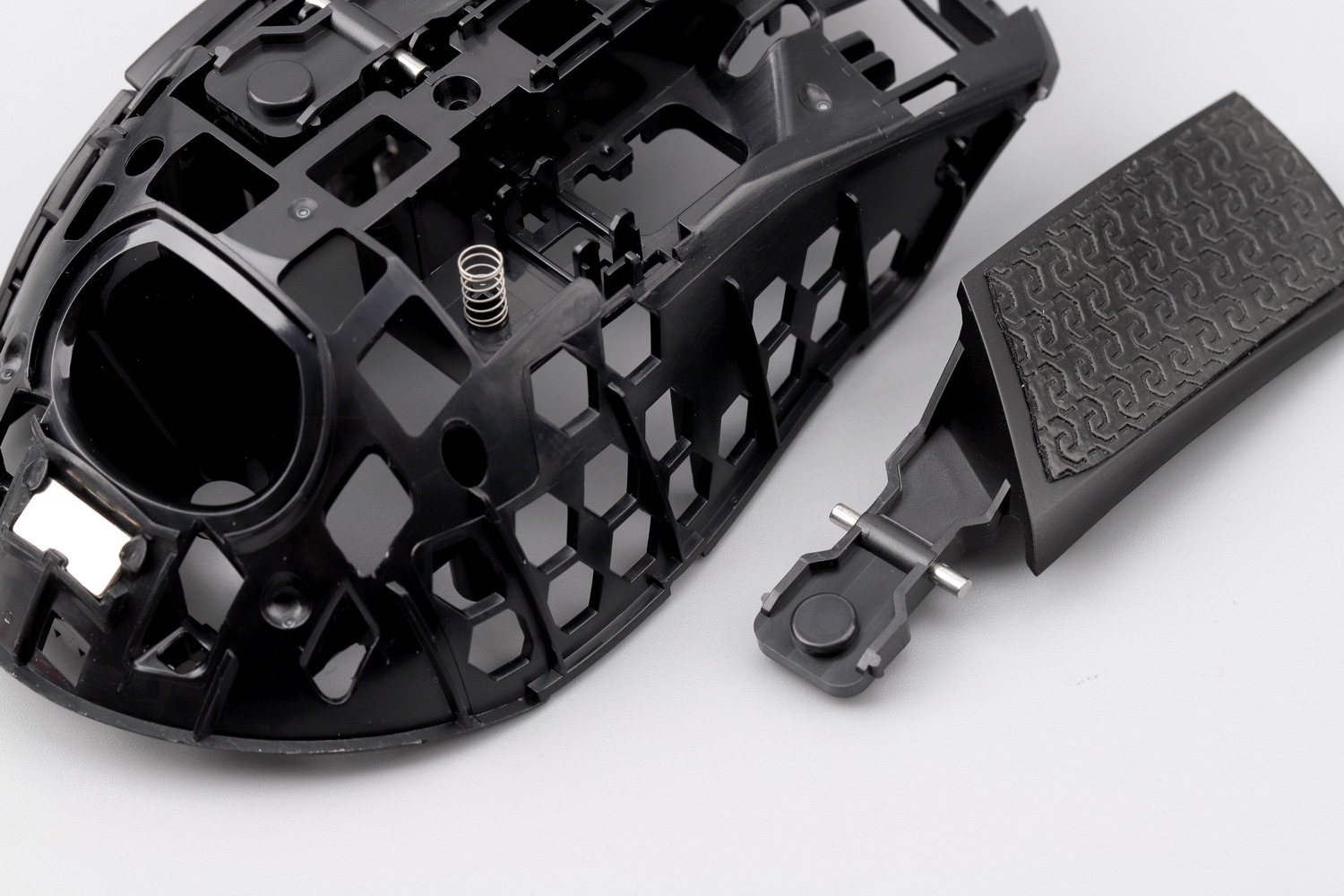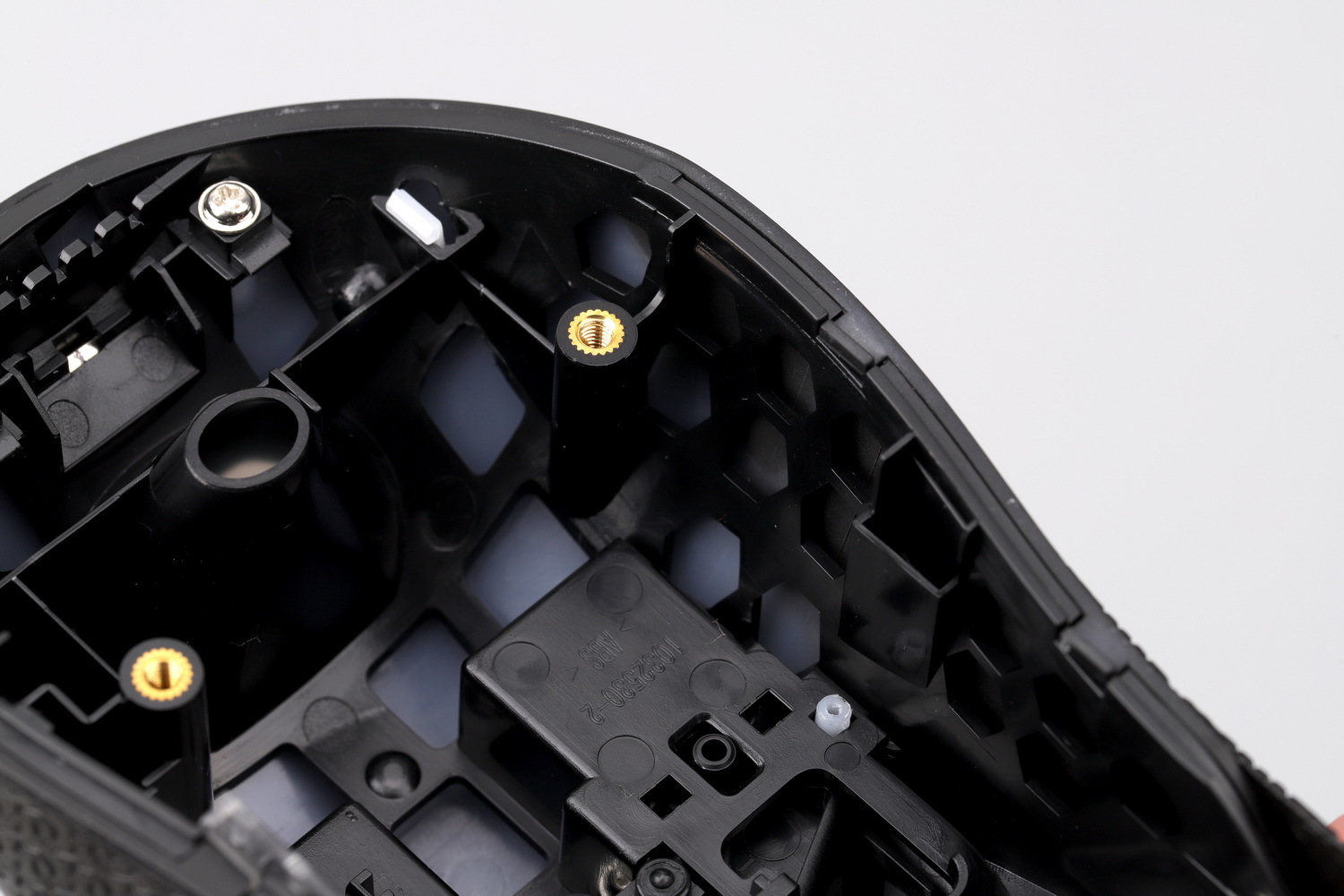 此外,为了降低鼠标重量,又不变成洞洞鼠标,战刃3的内框也采用镂空结构,方形和蜂窝状的结合,可以剔除不少不必要的塑胶料重量,所以这只体检较大、结构略复杂的鼠标的重量还能控制在89g,ROG保持着理性打造轻量化无线鼠标的态度。