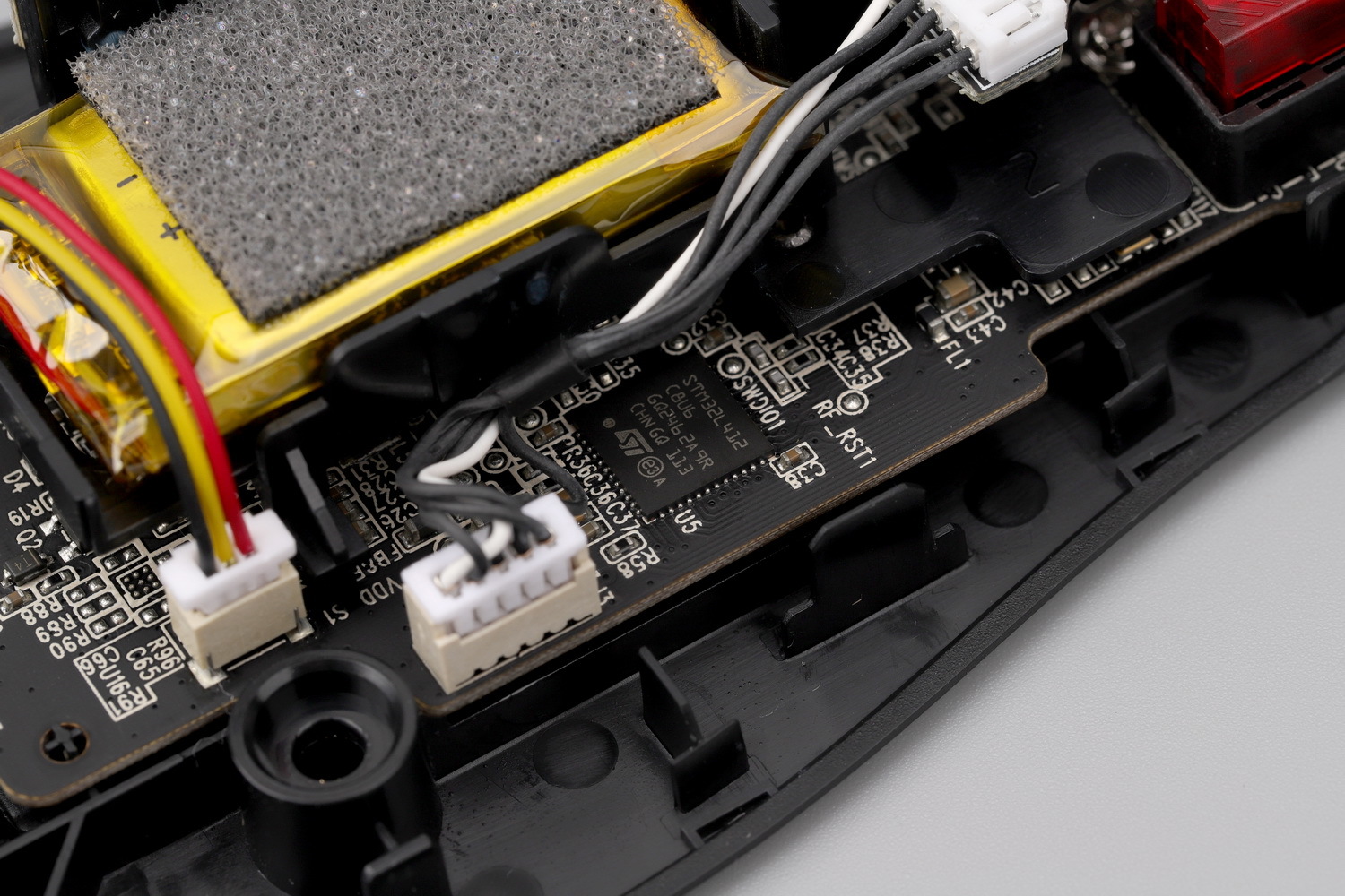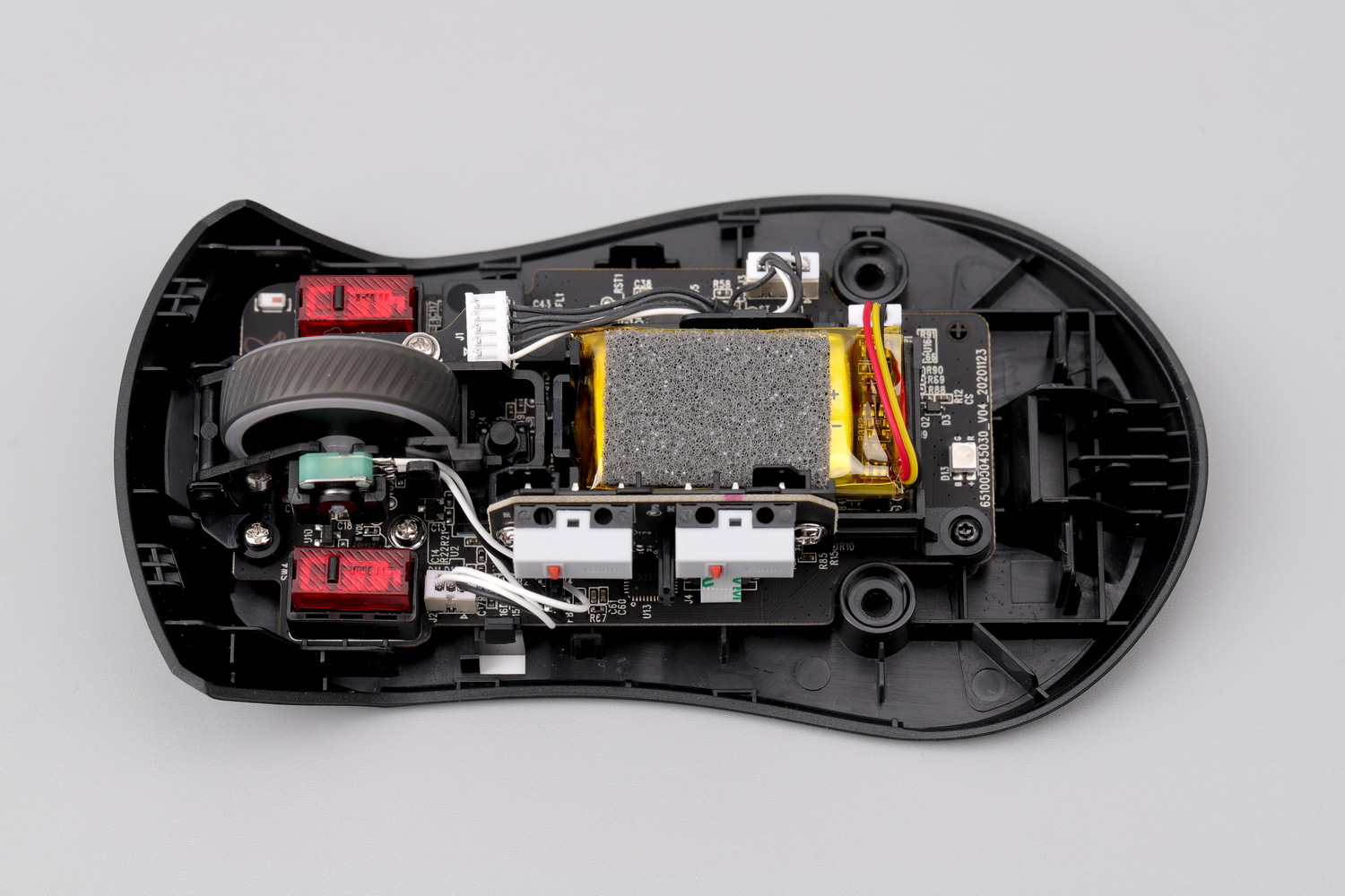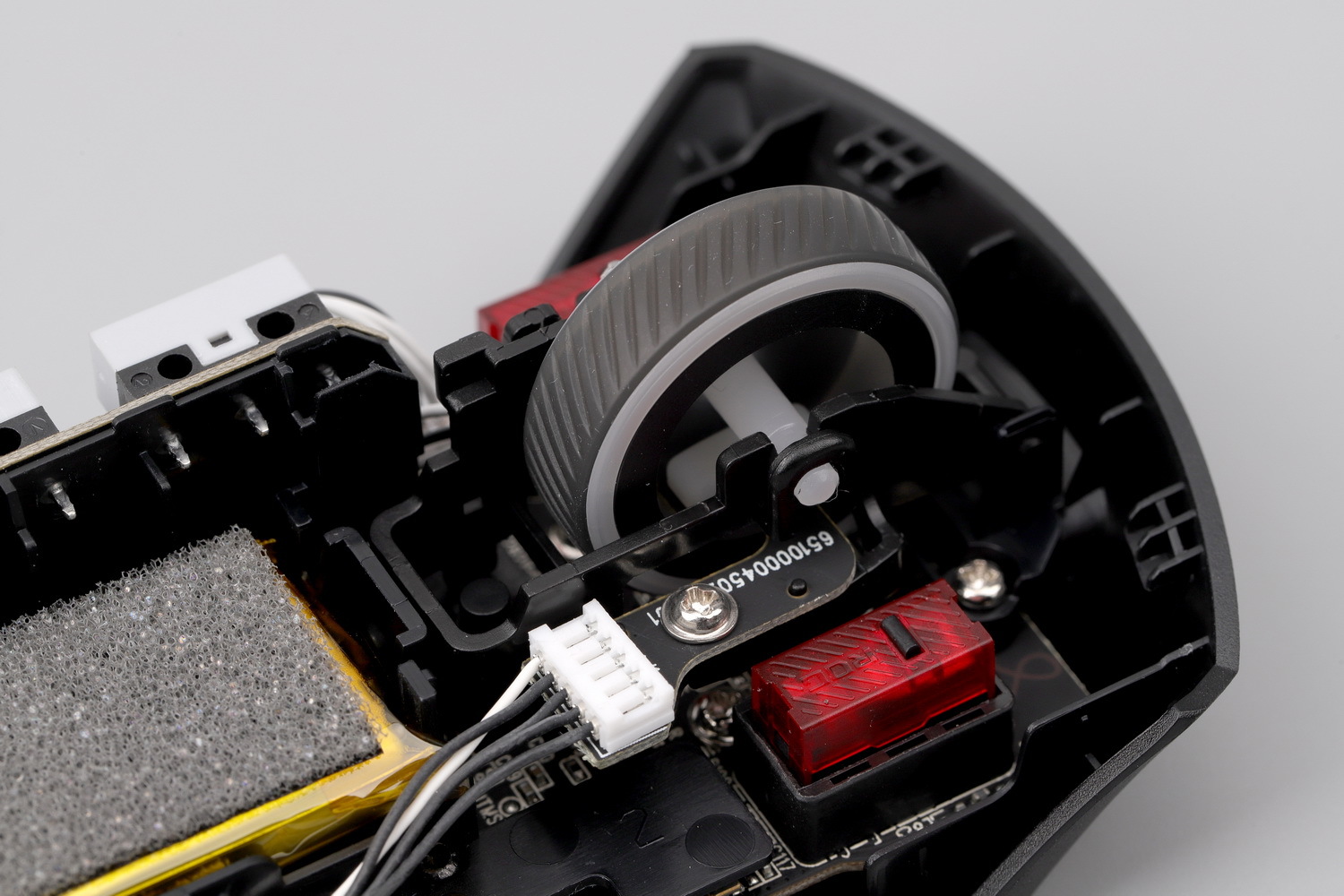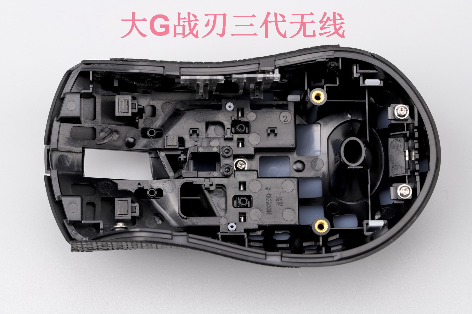 从电池的位置来看,战刃3无线版也考虑了的重心位置,实际体验来看,重心基本居中。而且为了滚轮的稳定和中键的手感,特制了一个浮动的滚轮托架,搭配方形编码器,整体效果也是可圈可点,相比大G二代,这个结构设计专业得多。