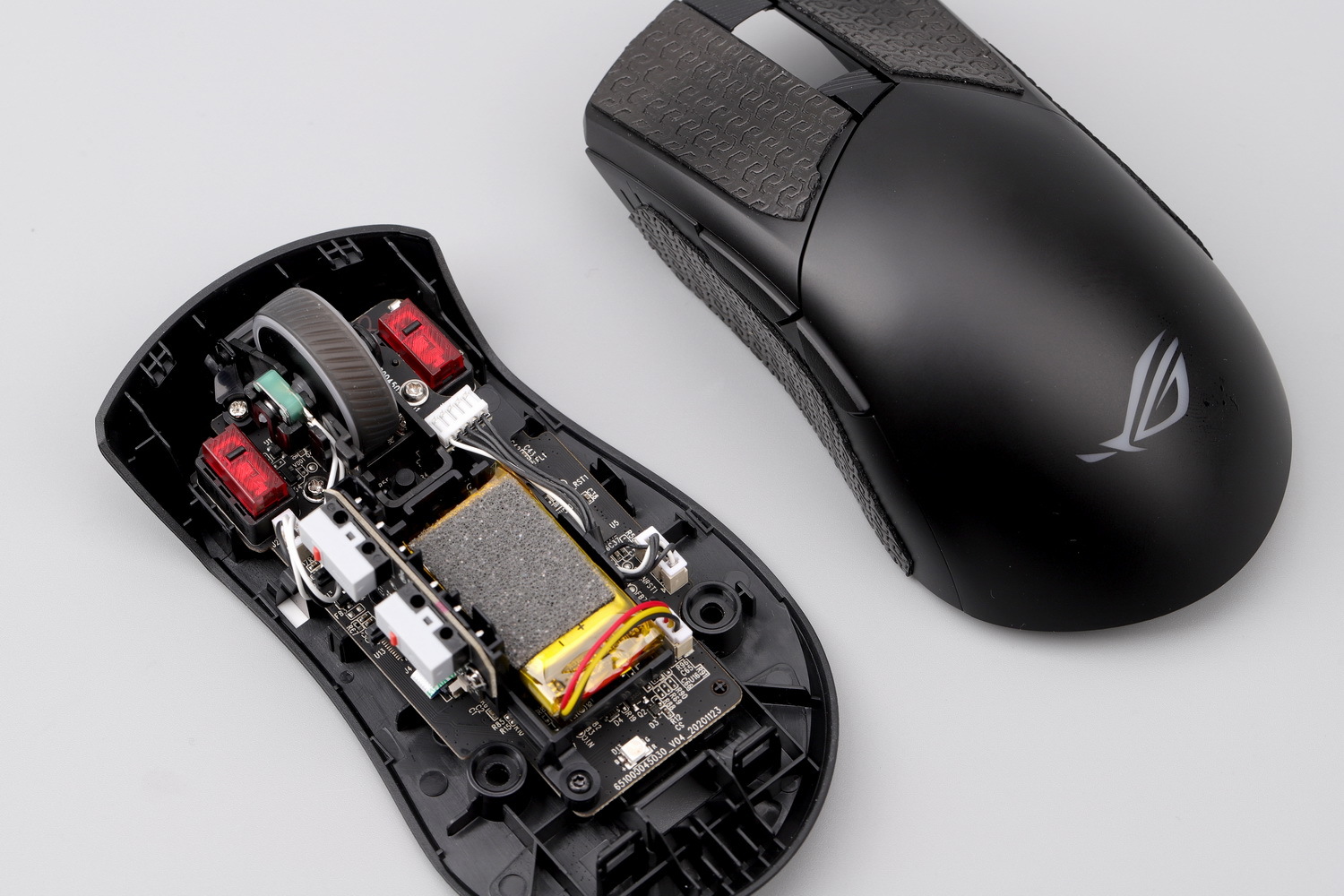左右按键配插拔底座,红色是Kailh为ROG定制的专属微动,非常抢眼的败家红色。其实,ROG从很早之前开始推出左右键微动可插拔技术,那时候微动寿命多数1~2000万次为主,旨在延长使用寿命。即便现在的微动寿命都高达5000万次甚至更高,他们依然保留了这个设计,并且提供两种手感不同的微动(如日产灰点)给玩家体验。现在大部分鼠标的附件都是做减法的,还送微动的?先得敢让你拆才行,但ROG一直在坚持。