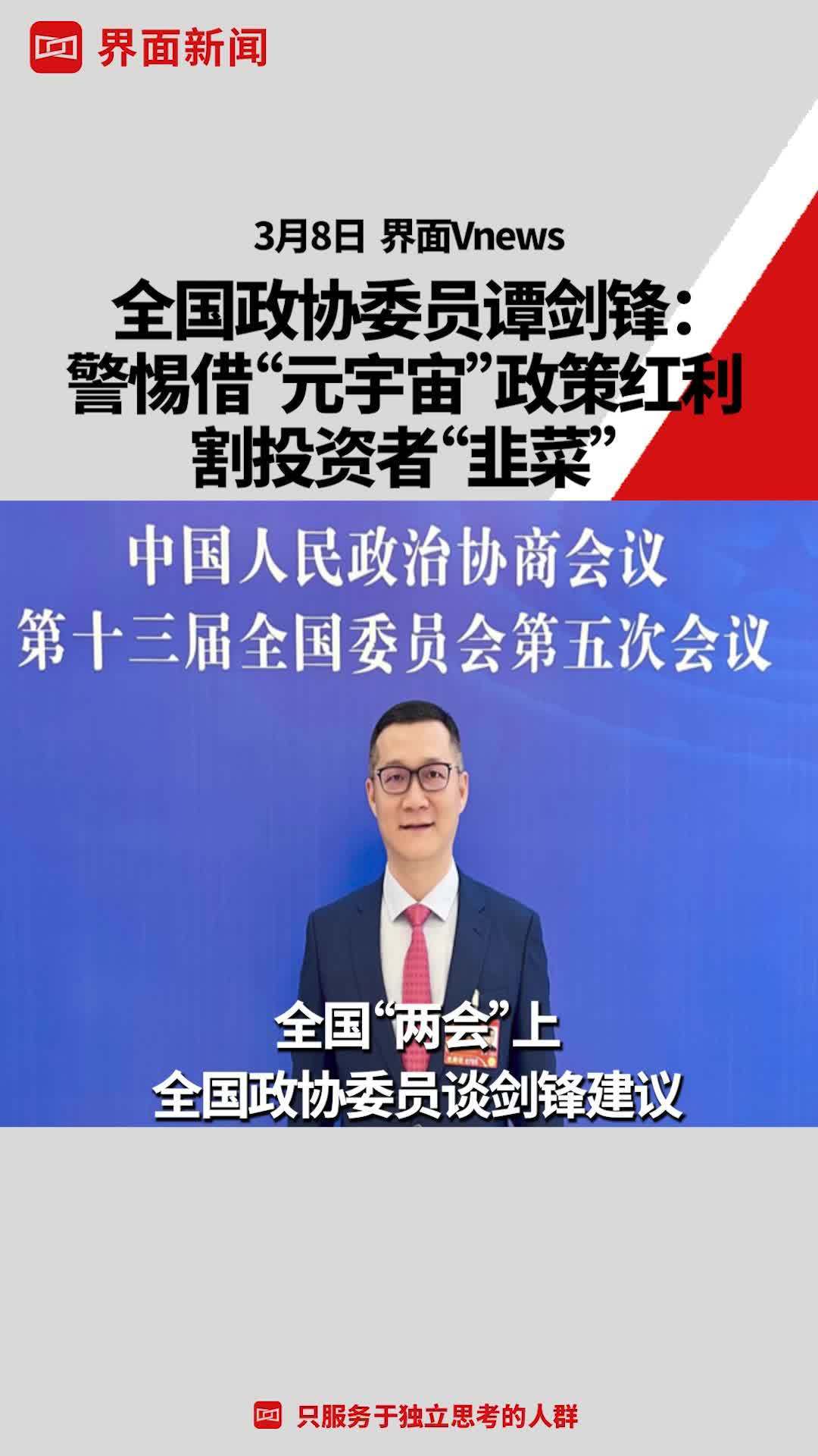 【全国政协委员谭剑锋:#警惕借元宇宙割投资者韭菜# 】全国“两会”上,全国政协委员谈剑锋建议,需防止个别人钻“元宇宙”政策红利“空子”,割投资者“韭菜”。“目前‘元宇宙’社区的治理、交易等规则都由企业巨头把控和引导”,“相关行业监管部门应提前研究监管政策,用法律规范进行监管”。@界面Vnews http://t.cn/A66bGxpz