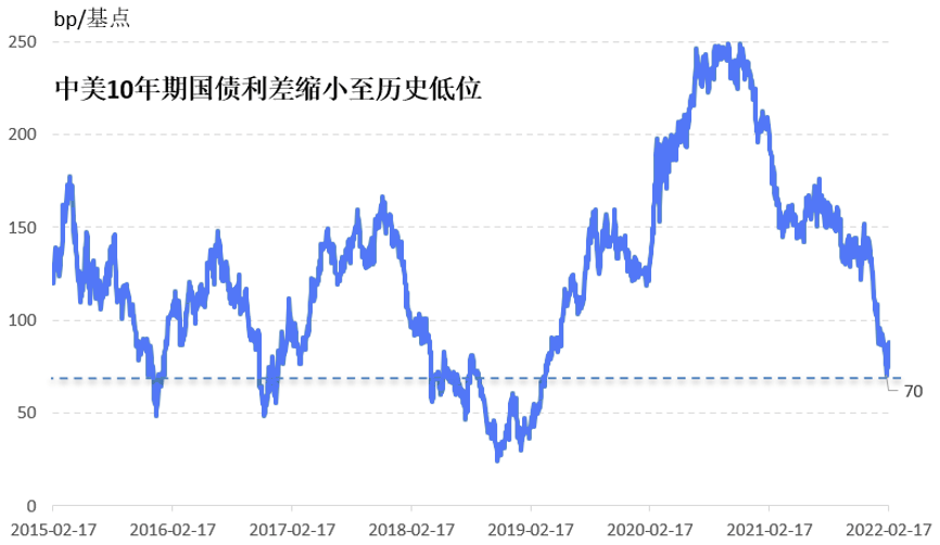 在此背景下,中美10年期国债利差已经从2021年最后一个交易日的125个基点,迅速缩小到了2022年2月18日的88个基点。甚至在2月10日,利差一度收缩到了70个基点。