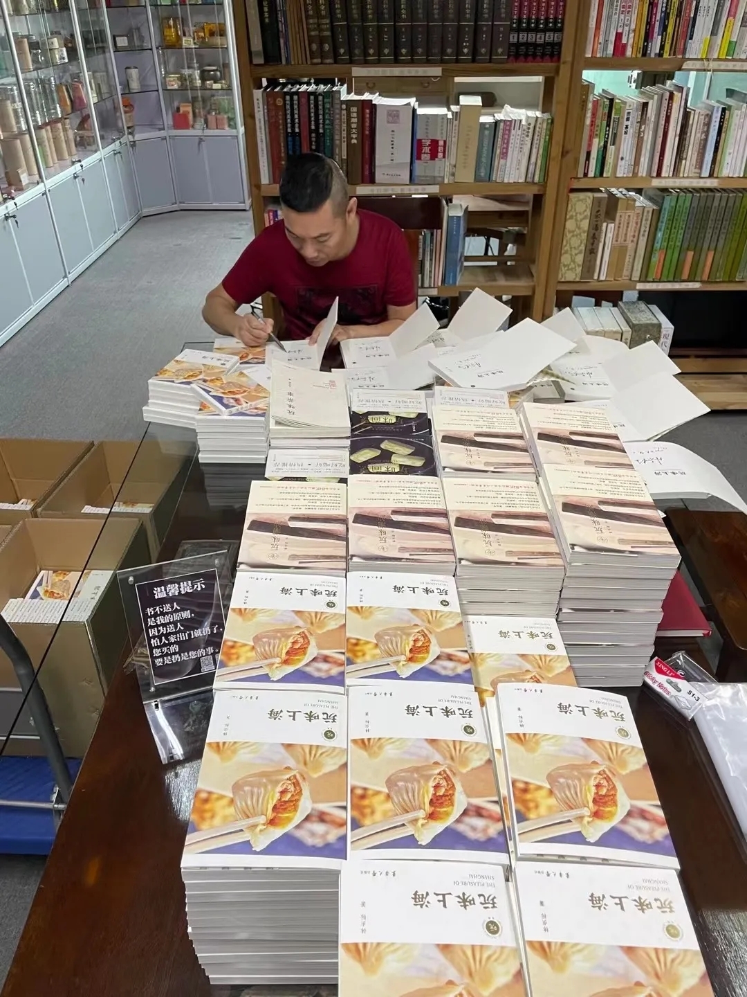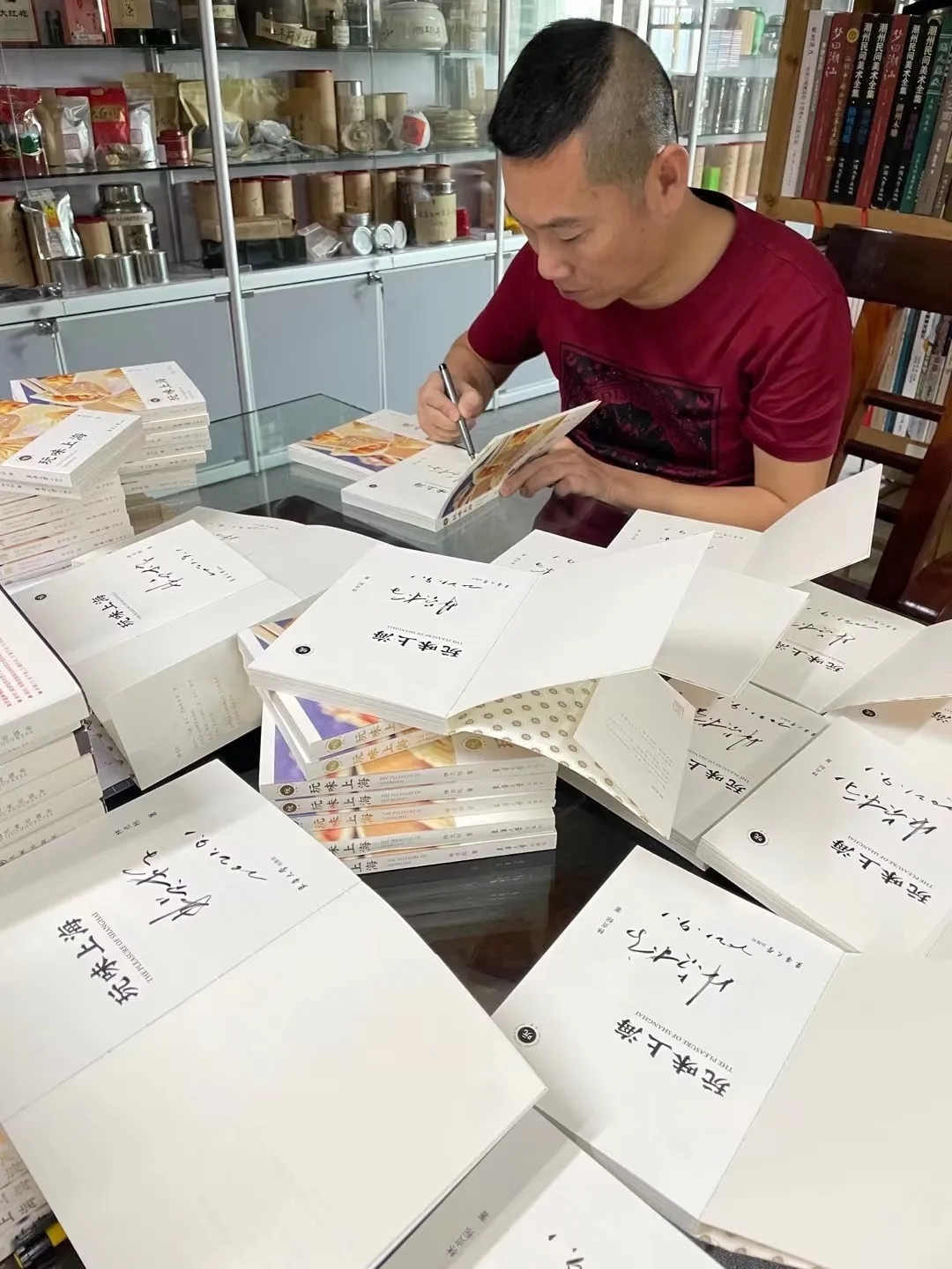 标哥的工作室,在一栋写字楼的顶层,基本上分成三个功能区,一个是他的茶叶储藏区,一个是他的厨房兼餐厅,一个是他的办公兼接待区,这个区域有两个茶室,一个只有茶叶和茶具,是纯喝茶的,一个既有茶又有书,书台上摆满了他的《玩味潮汕》和《玩味简烹》,如新华书店般。标哥说他的书只卖不送,让我心里闪过一阵尴尬:走的时候是否应该提出买两本书?不见有付款二维码,口袋里倒是有现金,找零钱时是要还是不要?或者让标哥打开收款码扫一扫?幸好标哥及时招呼我入座,内心的纠结也就打住了。