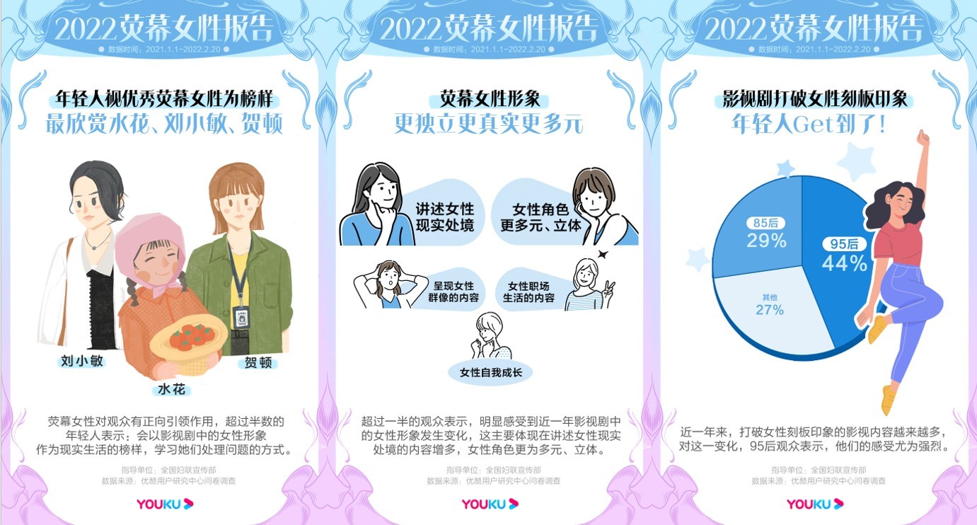 新京报讯(记者 张赫)3月8日,由全国妇联宣传部指导,优酷发布《2022荧幕女性报告》(以下简称《报告》)。《报告》显示,随着现实题材剧集的加码,近一年来荧幕女性呈现出形象更真实、性格更独立、职业更多元的特点。超过半数接受调研的年轻人表示,会将优秀的荧幕女性作为现实生活中的榜样。其中最受欢迎的是:《山海情》中的水花、《女心理师》中的心理咨询师贺顿和《小敏家》中的刘小敏。