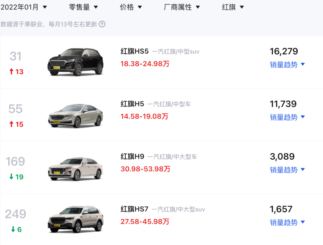 在销量方面,一汽红旗的销量主力车型为HS5、H5和H9,全年累计销量分别为129632辆、82168辆和33658辆。而今年1-2月一汽红旗累计销量为63800辆,同比增长40%,其中在今年1月份里,红旗汽车销量最好的车型依然为红旗HS5,1月累计销量为16279辆,其次为红旗H5,1月累计销量为11739。目前一汽红旗官方暂未公布2月份的具体车型销量数据,但汽车行业关注猜测,2月一汽红旗旗下产品销量最好的车型或许依然会是红旗HS5及红旗H5这两款车型。