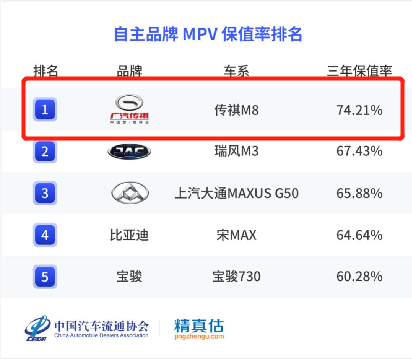 也正因为广汽传祺对于品控的坚持,在近期出炉的2021汽车之家保值率排行榜中,广汽M8高居中国品牌MPV排行第一,并且是唯一进入MPV总榜的国产豪华MPV。而在中国汽车流通协会和精真估联合发布的《2021年度中国汽车保值率报告》中,传祺M8以74%高保值率荣登自主品牌MPV榜单No1,与传祺GS8成为唯二保值率超70%的中国品牌。