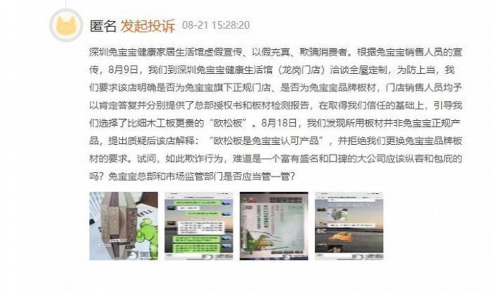 除此以外,还有一位消费者投诉称,自己在2020年12月在兔宝宝全屋定制门店内订购一套实木家具,当时确定柜体选用原木指接板,但到货后3个月却发现门店用劣质贴皮板材假冒原木板材,且按照原木板材高额收费。